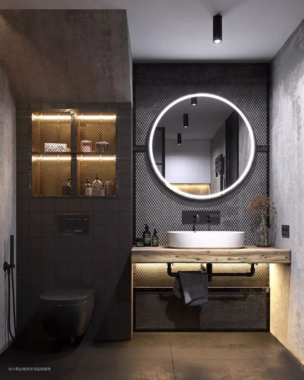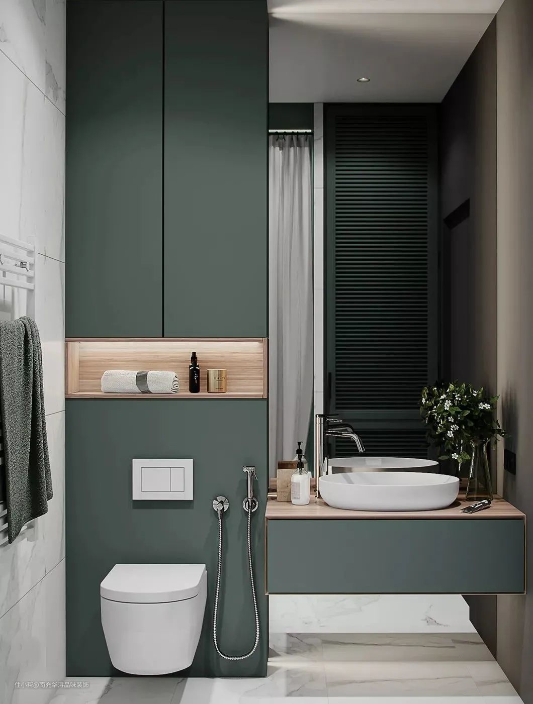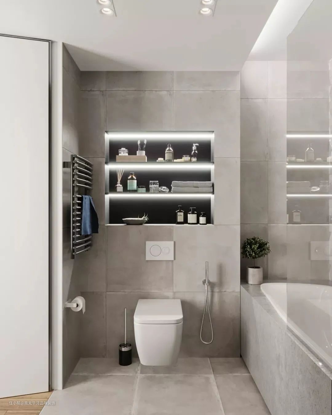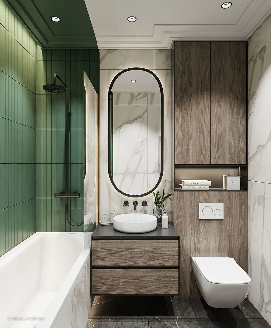 马桶后方的那面墙可以采用柜体+壁龛的设计形式,柜体可以收纳纸巾、马桶清洁剂等物品,壁龛可以放精油、绿植,手机等用品,拿取非常方便。