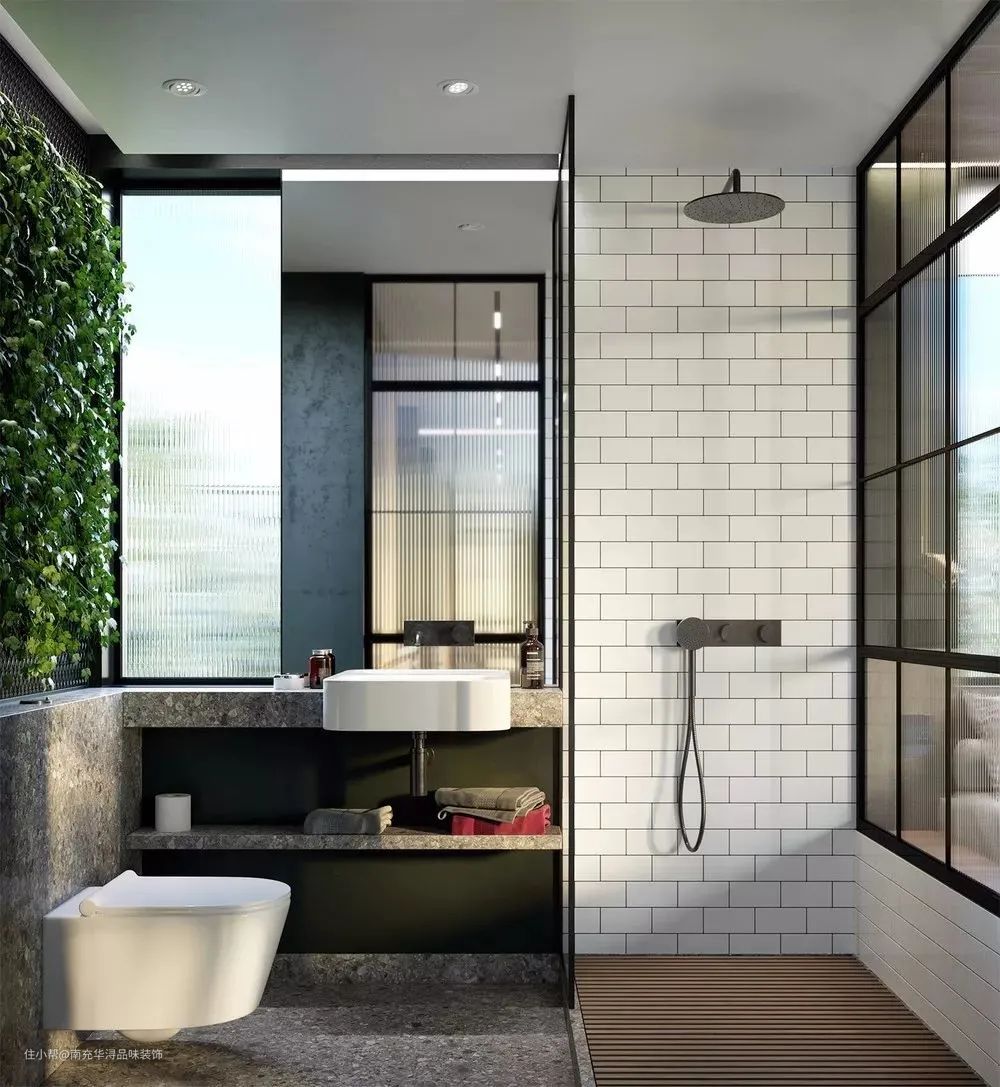 最简单的就是直接一个台面设计,壁台上可放置一些小物品,壁台上方的墙面通过处理后可铺设绿萝,起到净化厕所空气的效果。