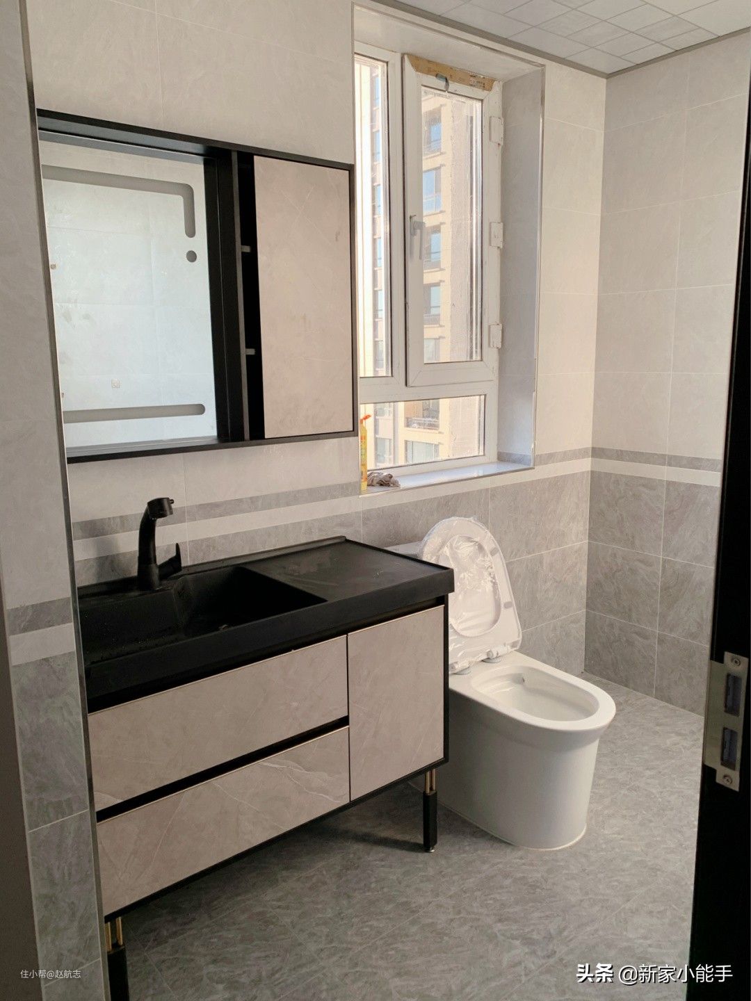 主卧拥有独立的卫生间,不过没有做干湿分离,不影响使用。地面和墙面铺贴的瓷砖很耐脏,以后做保洁的时候,方便很多。安装了柜式镜子,牙膏牙刷都方便收纳起来,觉得还不错哈。