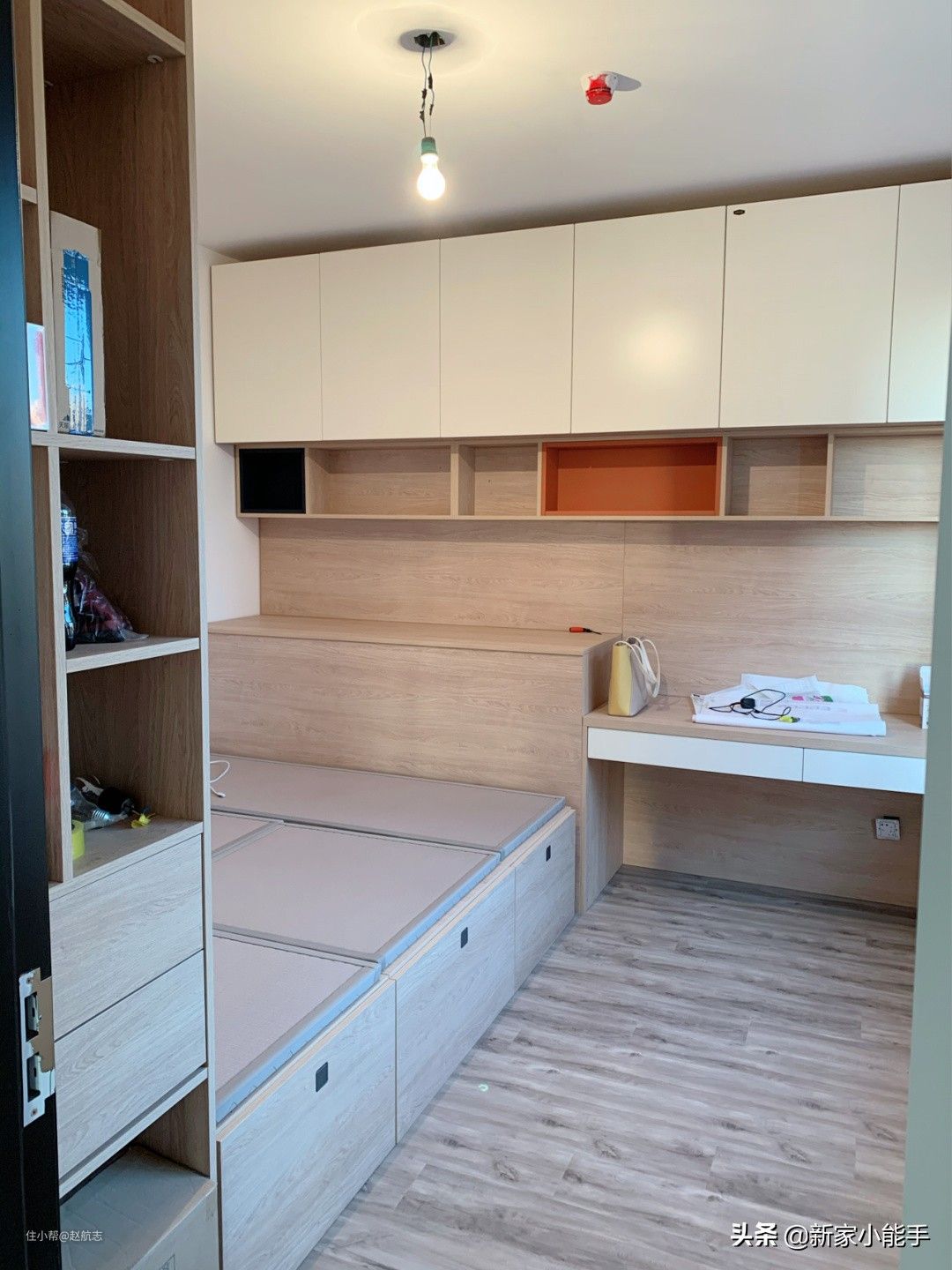 次卧定制了非常实用的榻榻米,刚好把小小空间利用起来,实用非常方便,而且榻榻米刚好把小小空间利用起来,使用功能特别强大。榻榻米所使用的板材是免漆板,减少油漆,比较环保哈。