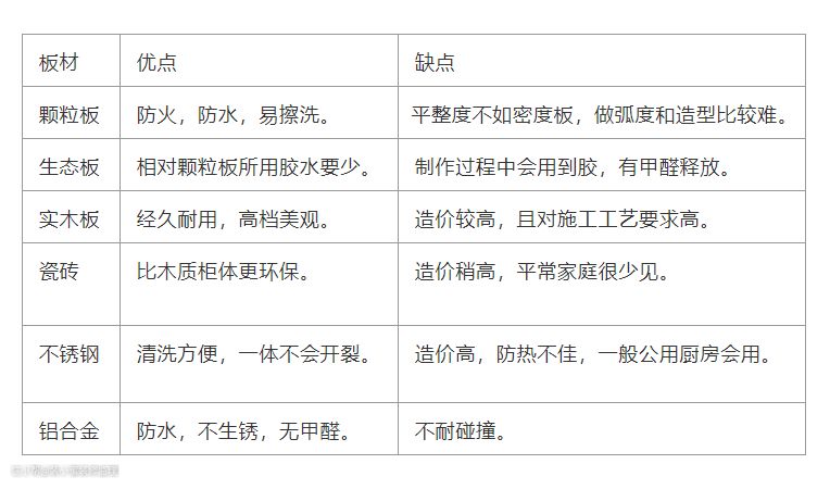 市面上常用的橱柜柜体有颗粒板、生态板、实木板、瓷砖、不锈钢、铝合金等(具体的颗粒板、生态板下还有许多细分),优劣简单对比如下: