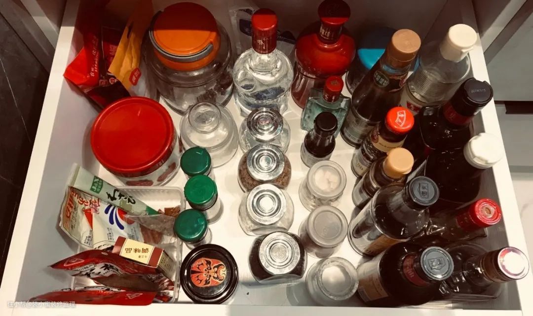 调料拉篮的设计还需要注意,高度一定要比日常超市售卖的油盐酱醋瓶高度高一点,屋主家这个抽屉的净高是26.7cm,刚好比瓶子26cm高一点点。