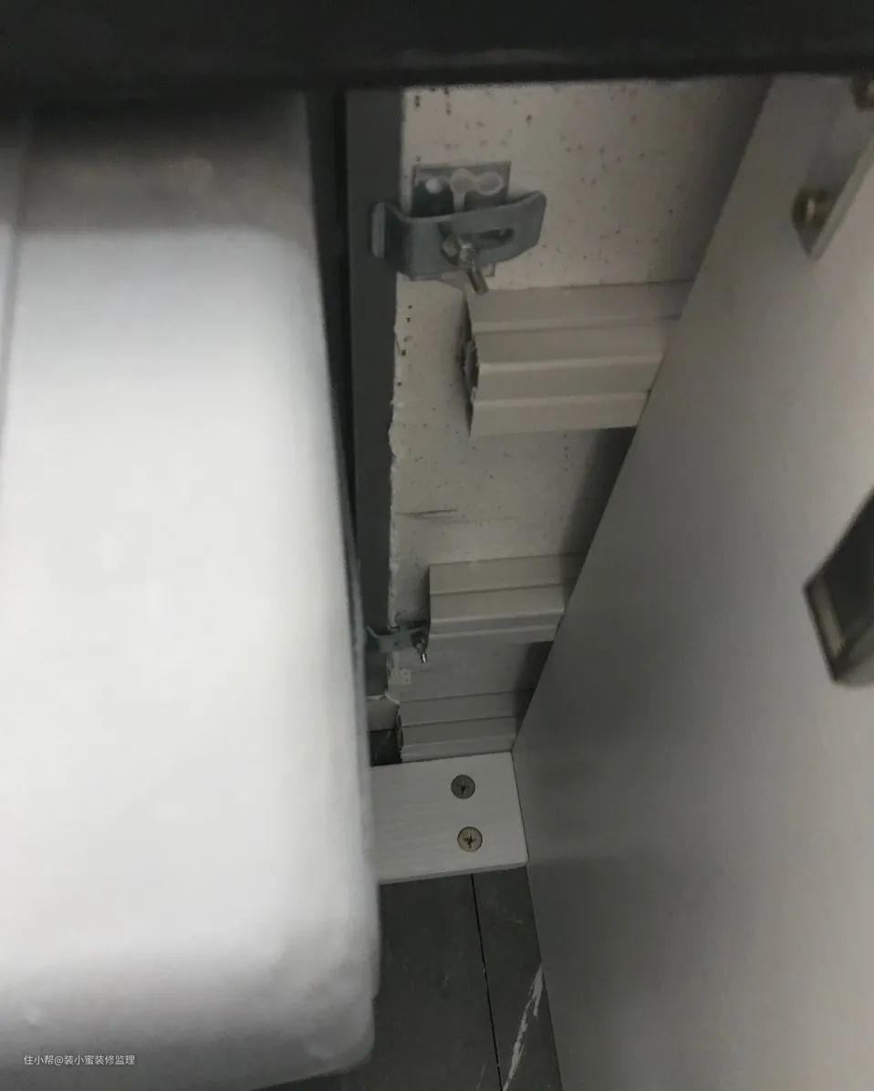 第二就是水槽下面的防潮处理,大多数橱柜商家用的是铝箔板防潮,屋主家的橱柜商家采用了不锈钢板包的方式,屋主感觉如果能够向左右立面再延伸一些就更好。