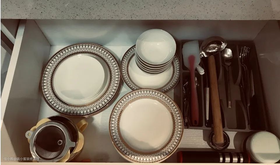 高柜下方两个600mm的抽屉,上层放调料品,下层放日常用得较少的招待客人才用的杯碟、茶具、酒具;