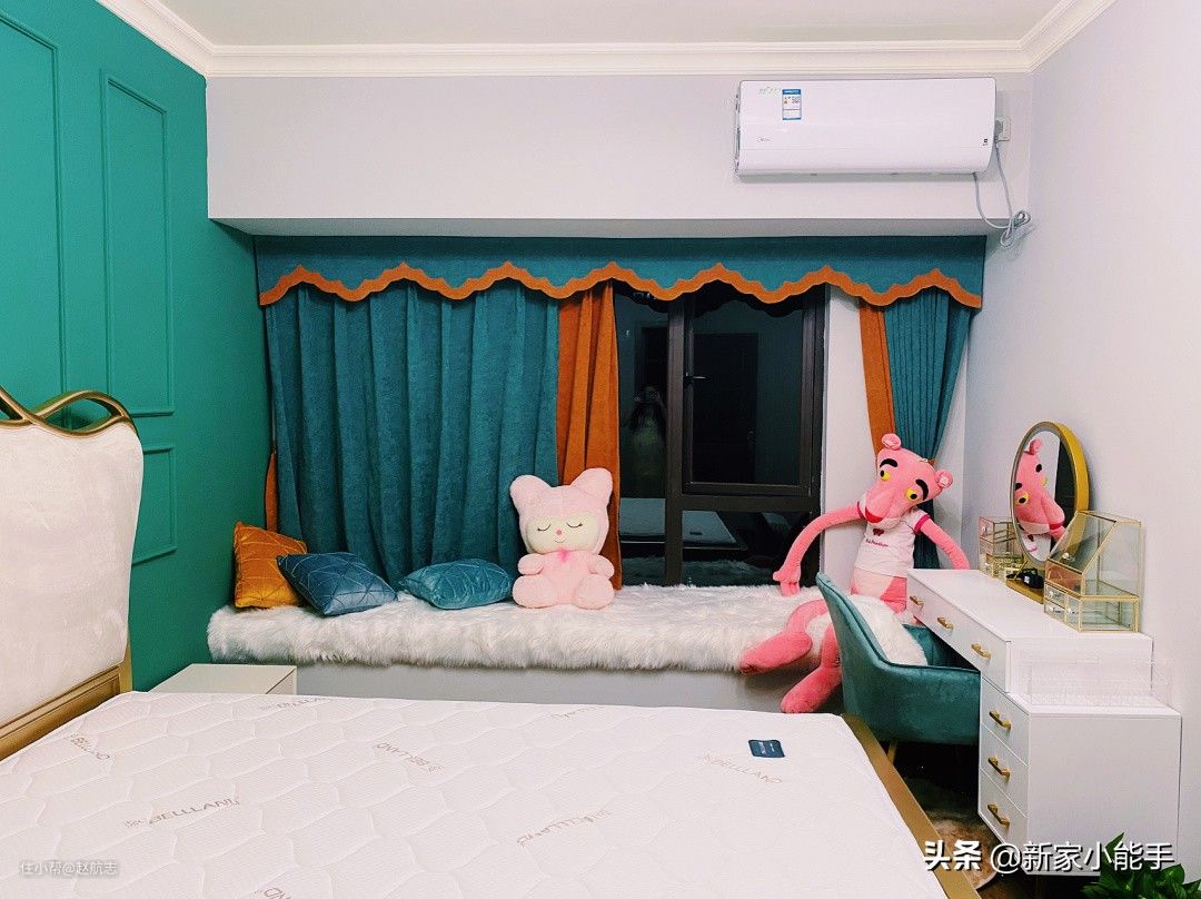 大大的飘窗保留着,飘窗上放着毛毯坐垫,坐着很舒服。右边摆放着梳妆台,可以非常女屋主使用,太幸福了。安装的窗帘很喜欢,可以起到很好的遮挡。