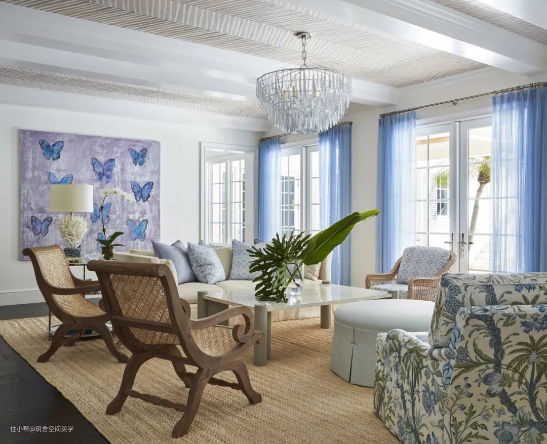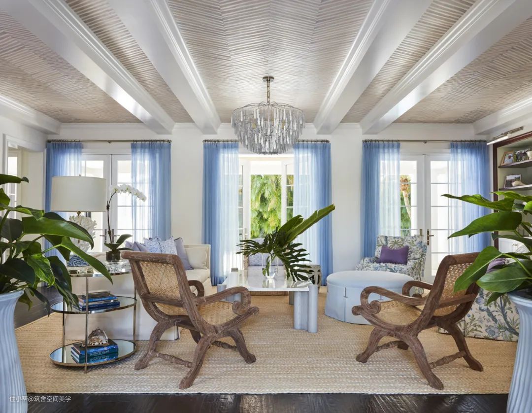 轻薄的纱质窗帘很适合光线良好而调高不算特别突出的房间,搭配简约的中性色调的家具,贴近自然的色调和材质,打造浪漫的度假感觉。