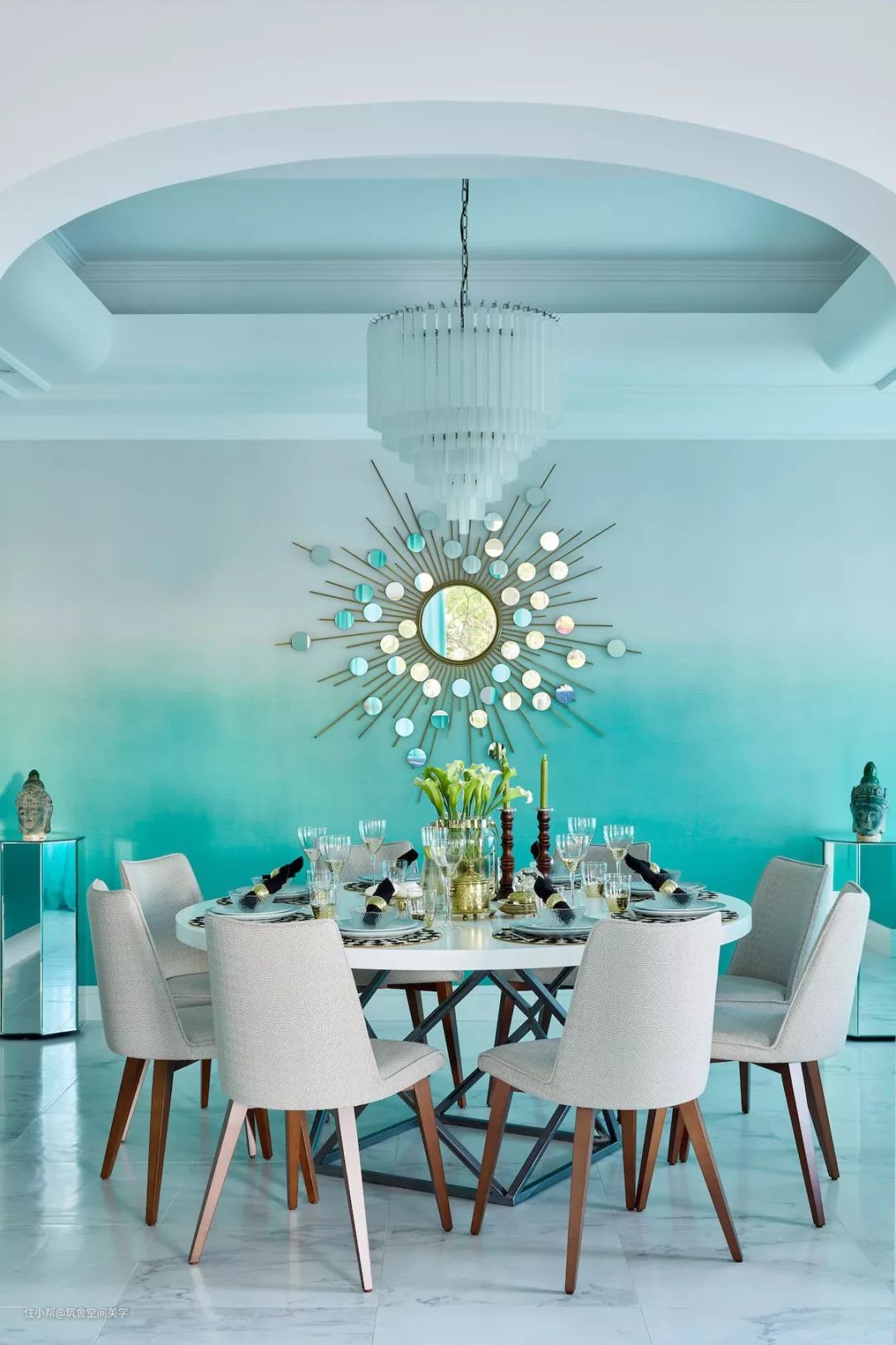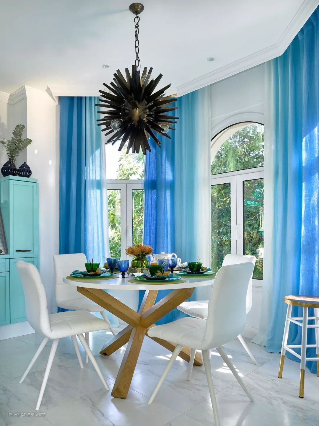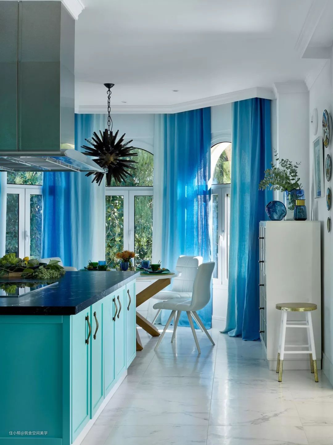 蓝色系餐厅主视觉效果偏冷静,施加在空间里的灰色系窗帘呈现出一贯的优雅知性气质,配合地板和地毯的颜色给人的收敛感,并减弱纯蓝色环境的刺激性,整个空间布局显得稳定而低调。