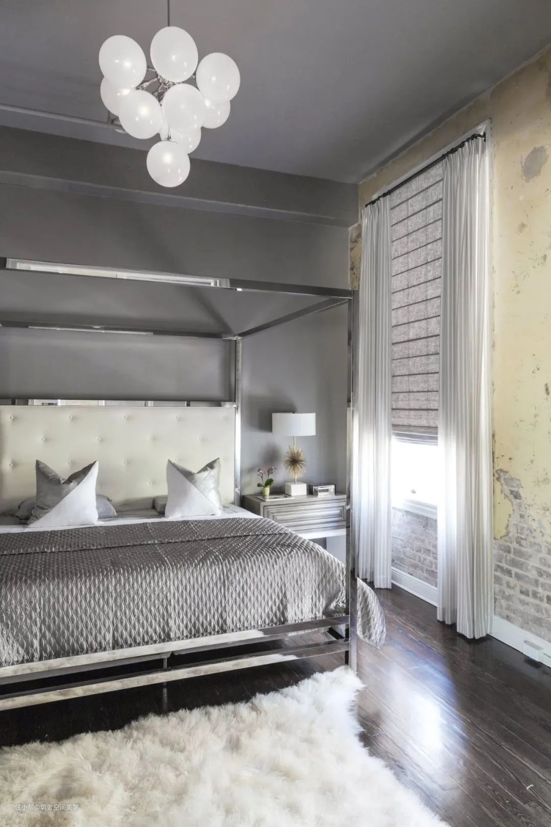 蒸汽灰的绸缎窗帘像是专为罗曼蒂克(romantic)而生,耀眼闪亮的色泽,穿透岁月的年轮,写意爱与美的灵魂。