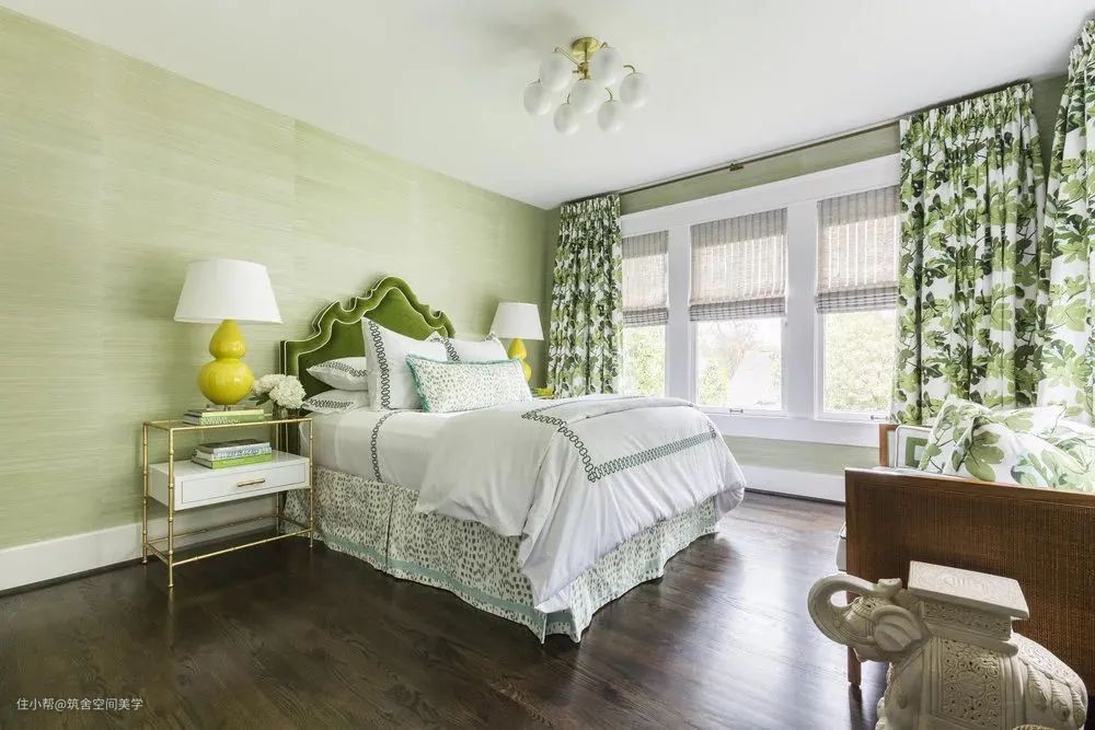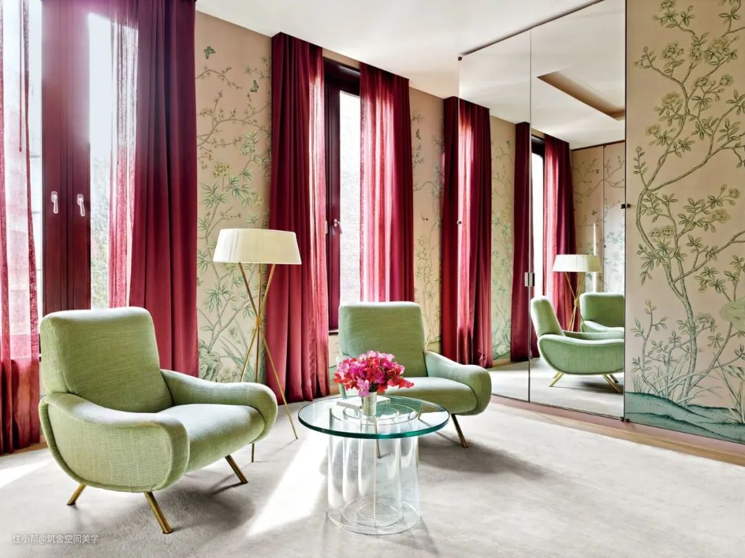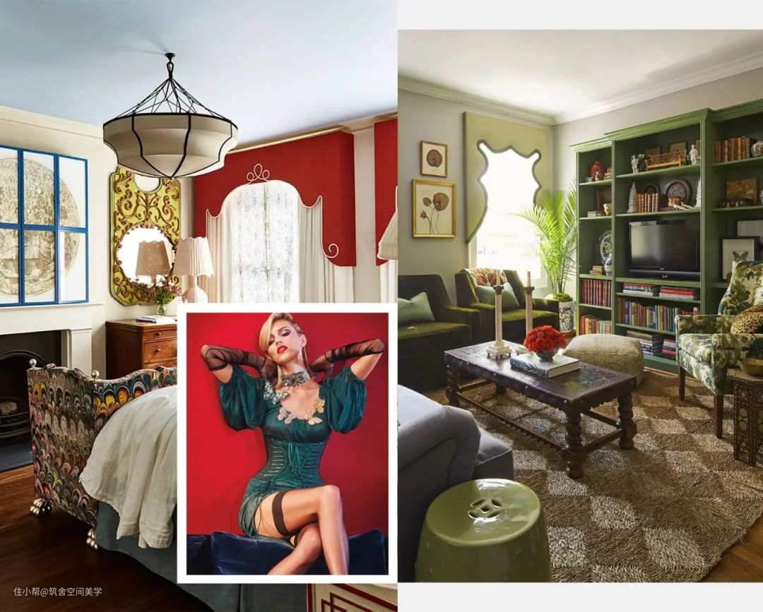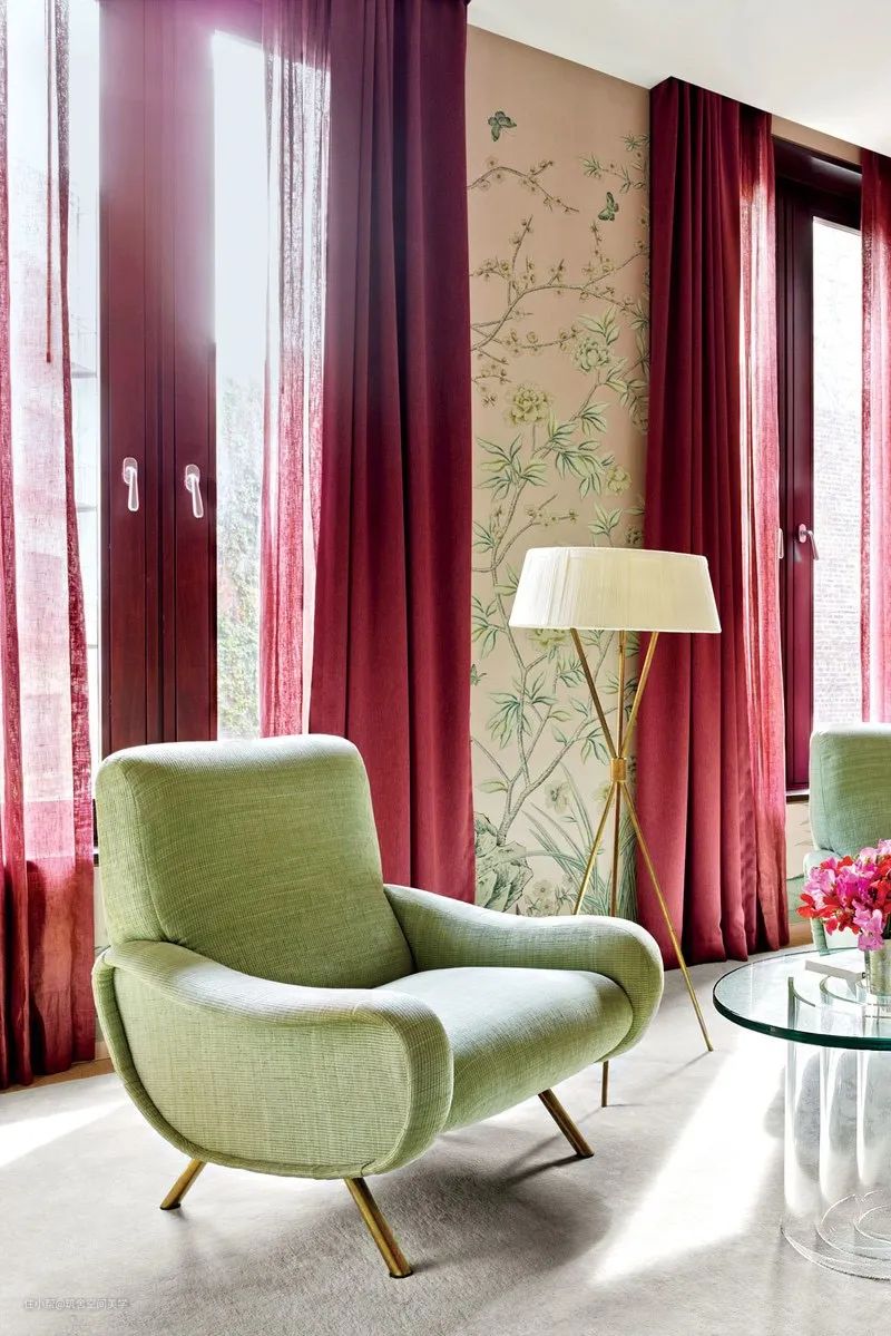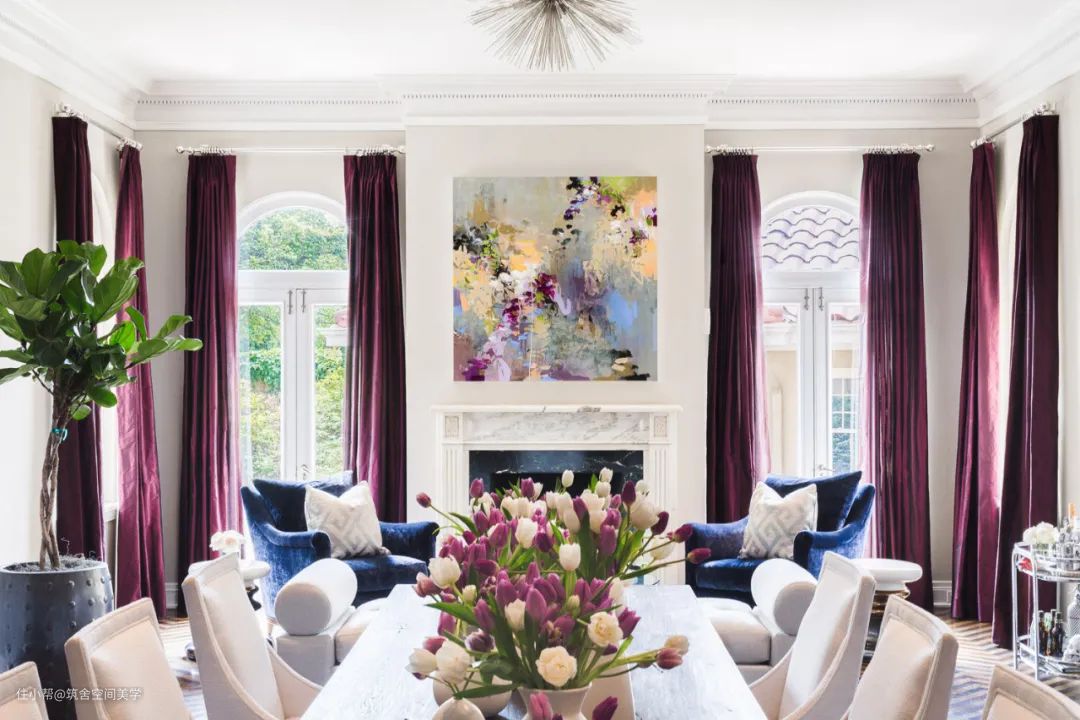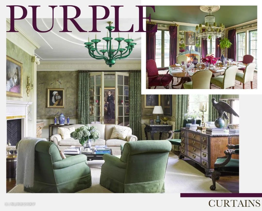 同理,绿与紫的颜色对比加剧环境氛围的戏剧性,在视觉上产生精致高贵的感官冲击,比起绿色调碎花窗帘诠释的森林自然感,带有光泽度的天鹅绒紫色调窗帘更加充满诱惑力。