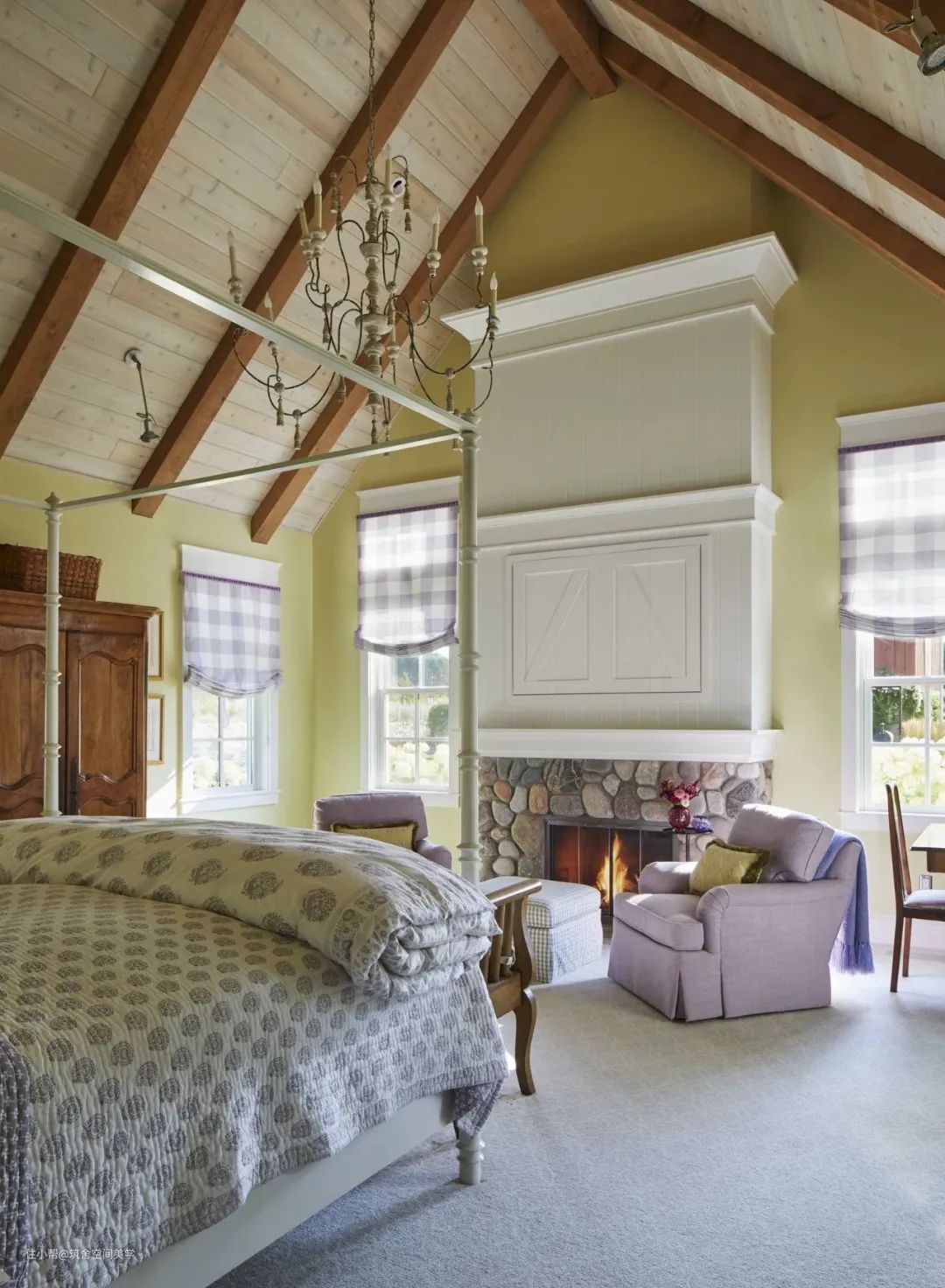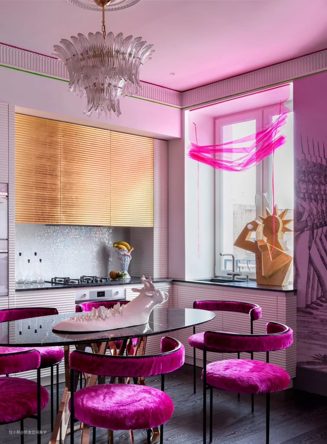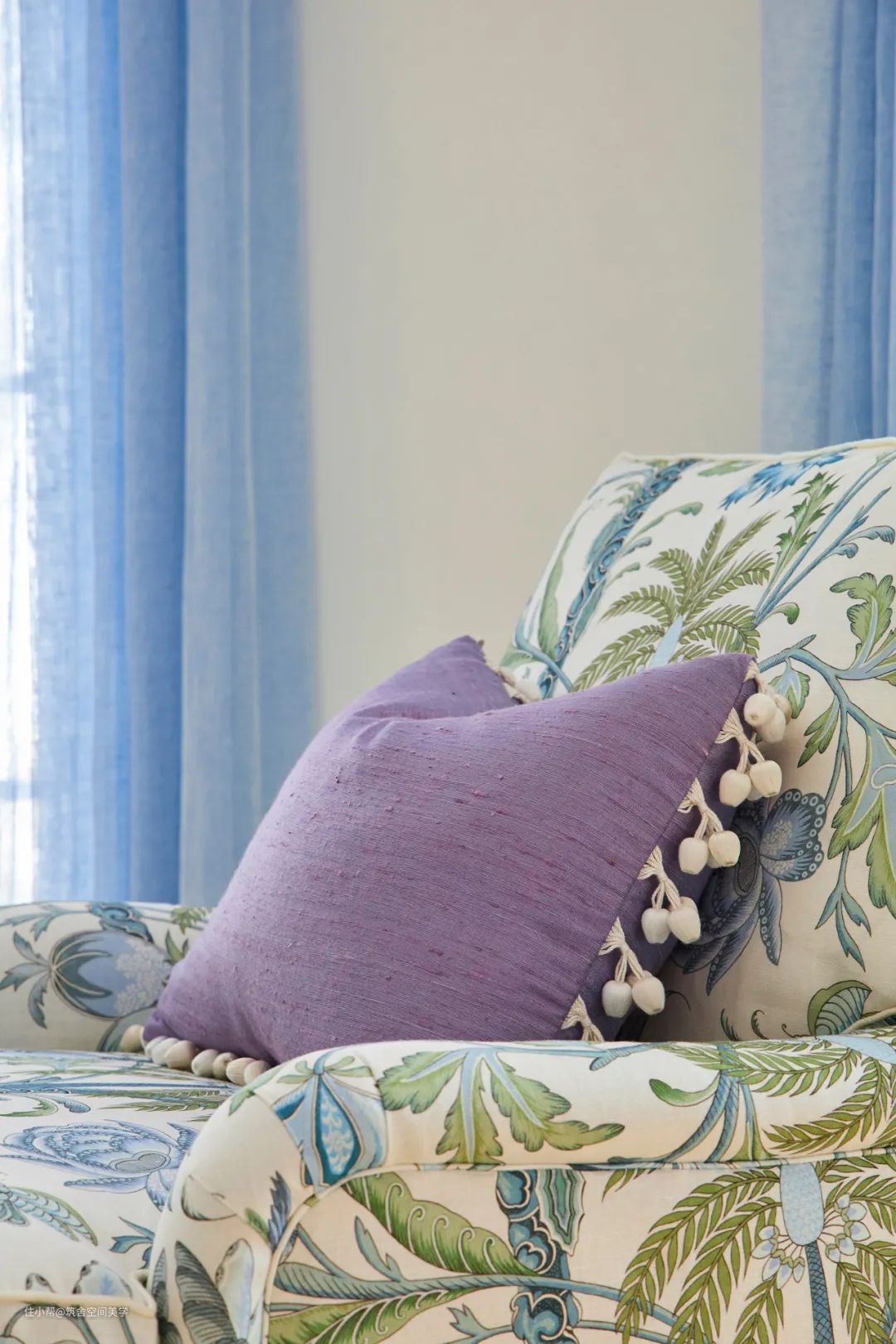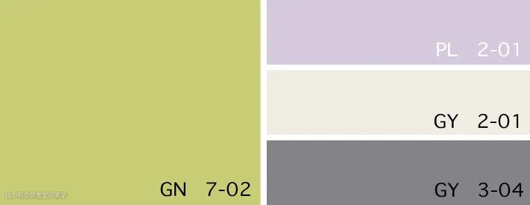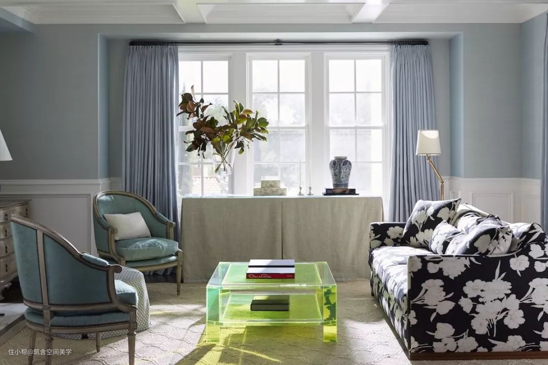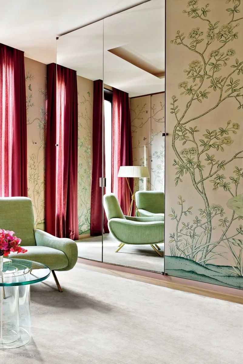 同理,绿与紫的颜色对比加剧环境氛围的戏剧性,在视觉上产生精致高贵的感官冲击,比起绿色调碎花窗帘诠释的森林自然感,带有光泽度的天鹅绒紫色调窗帘更加充满诱惑力。