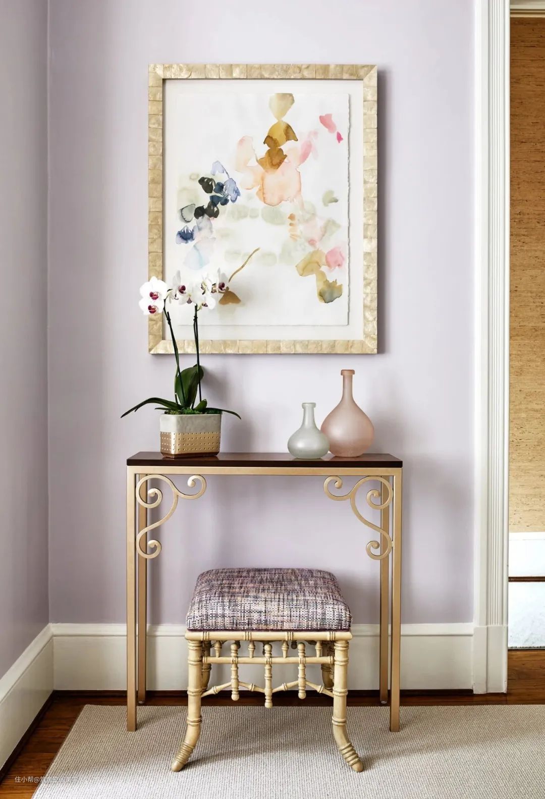 浅紫打底的素色纹理窗帘给人知性、优雅的一面,简简单单的装饰性用于区别空间层次以及创造色彩自然过渡的情景,这种毫不设防地、不具任何攻击力的色彩搭配,有种温柔阳光穿透树梢般的梦幻感觉。