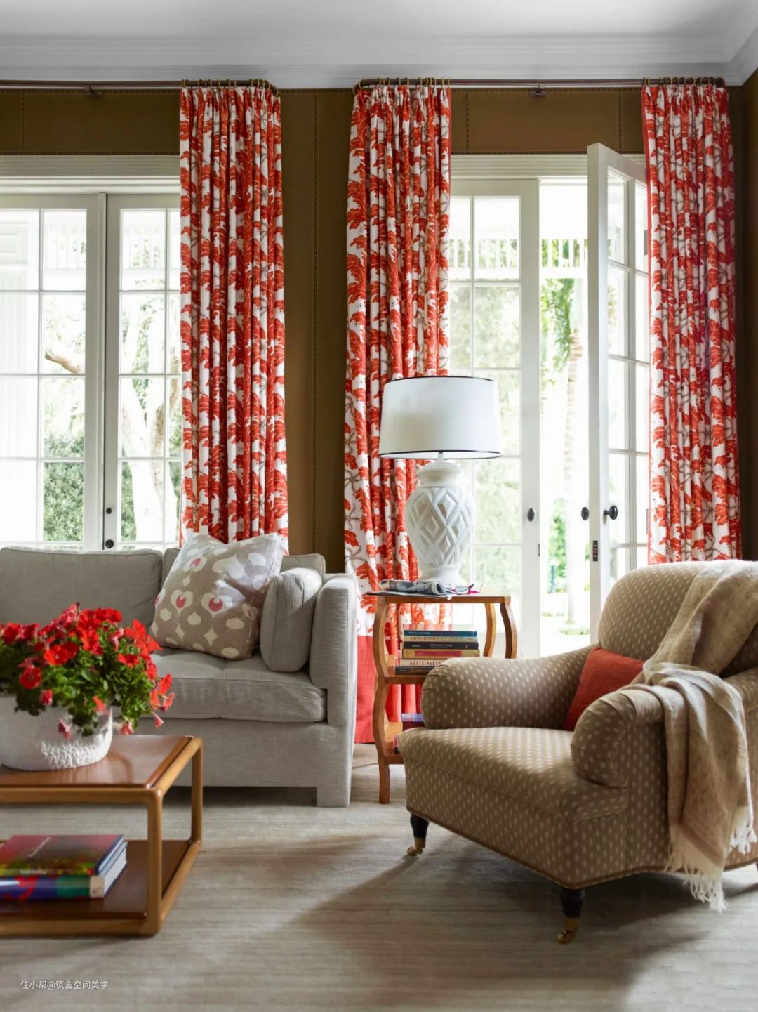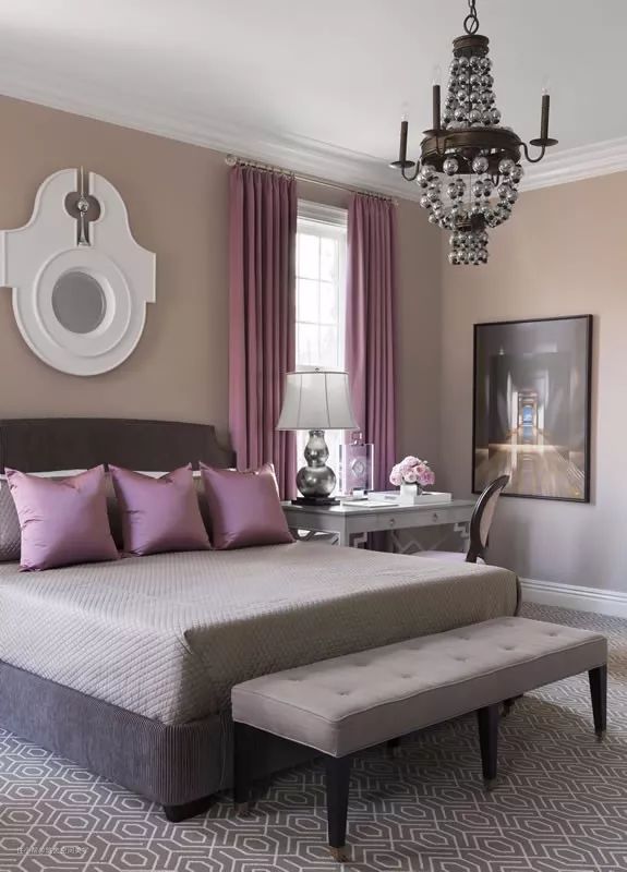 但是,当窗帘由冷灰色调换成色彩对比更强烈的暖棕色系时,华丽感盈然而生,让人眼前一亮。暖色调的饱胀感加剧空间的色彩流动性,从而在视觉印象中留下充满挑战感的深刻记忆。绿色系窗帘>>>紫色系窗帘