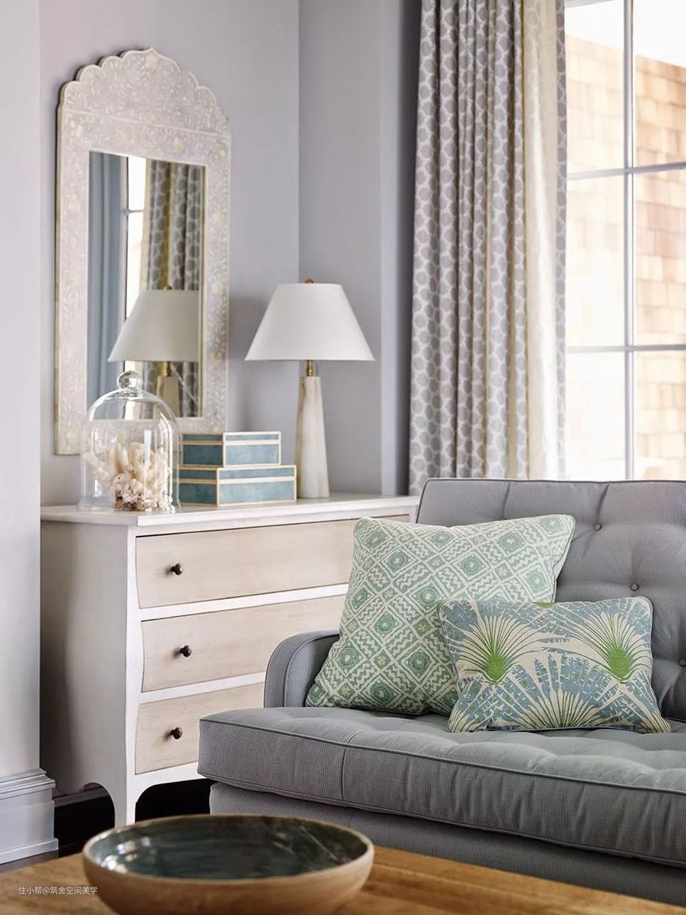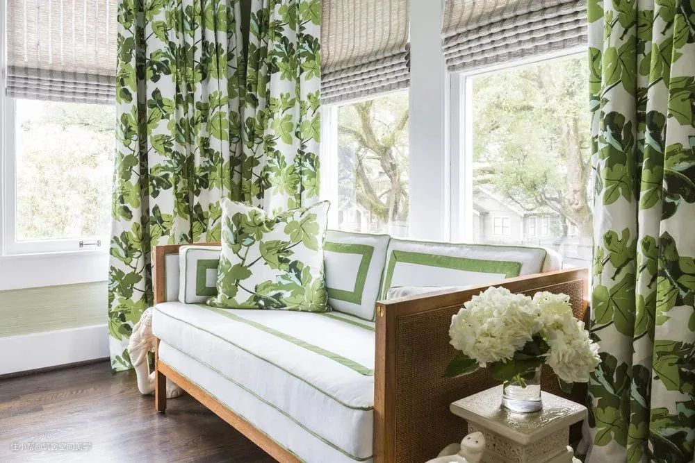 灰绿明媚而纯粹,如和风细雨拂过,群山秀朗而水润,又暮霭轻雾袅绕,唯美得不似人间。绿洲色的窗帘花纹与白底布艺几经揉合,仿佛悠悠碧水影拓天天际的祥彩流云,满目的萃绿,像幽静山谷爬满青茏葱郁的绿植,令人心旷神怡。