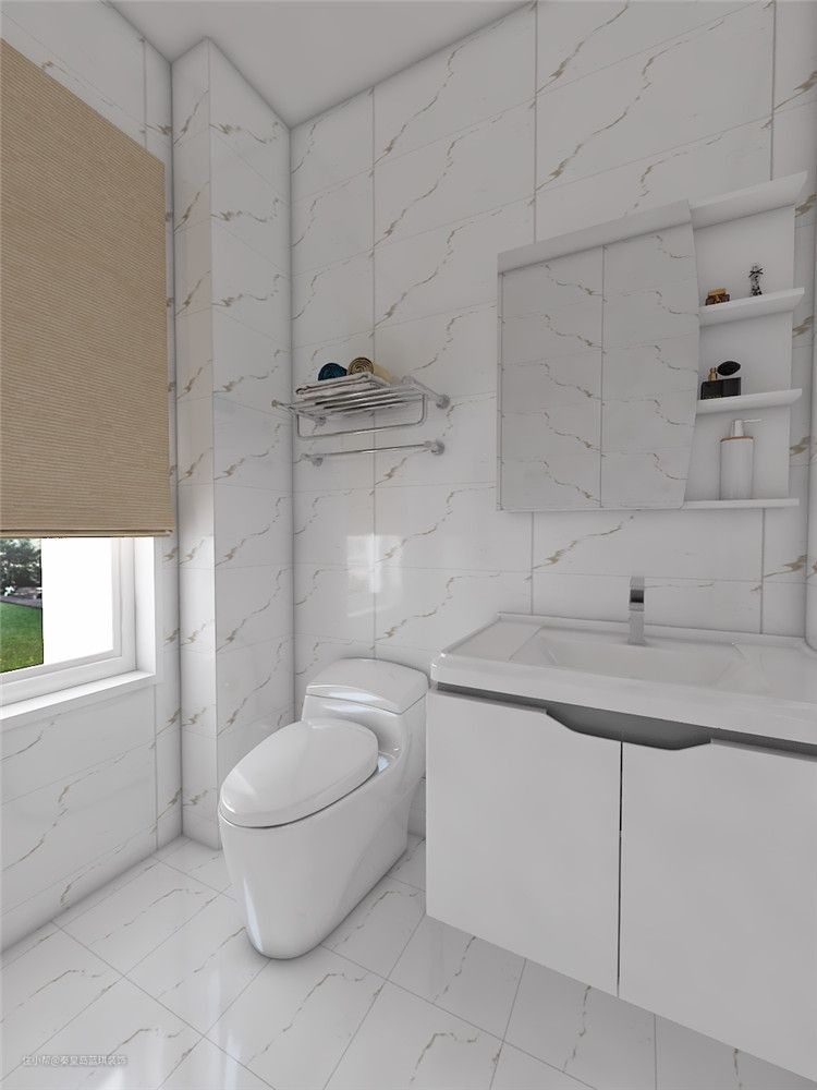 卫生间墙砖和地砖通铺白色花纹瓷砖,营造出海浪流动的画面感,置身其中,就像踩在那片白色沙滩上,倾听海浪的声音。