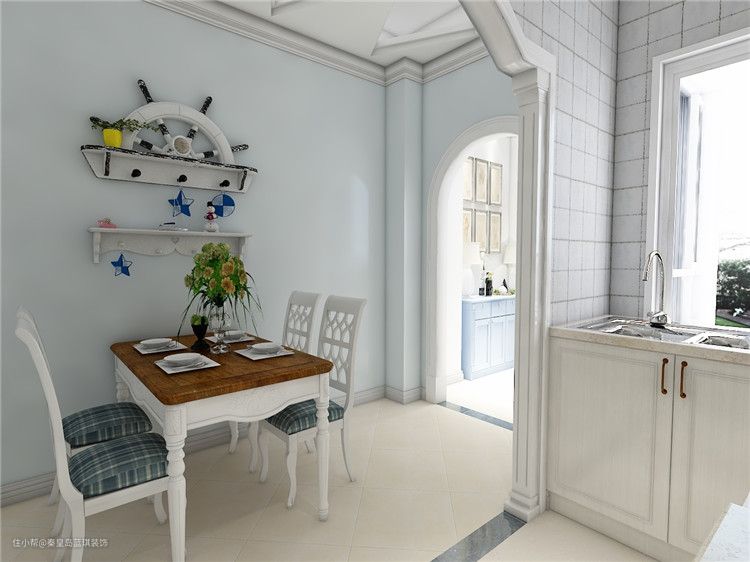 厨房采用L型厨柜设计既合理使用了空间,又符合流畅的厨房操作动线,镂空设计柜门是地中海风的经典元素。