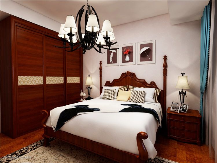 美式风主卧选用清新的蓝色墙面,营造出自然舒适的睡眠环境,嵌入式衣柜充分利用墙体的空间,实用又美观。