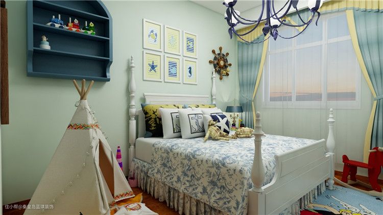 整体色调为清新浅绿色的儿童房是家中色彩最多的小世界,蓝色的墙壁置物架方便收纳小玩具,又巧妙的避免了地面家具磕碰的危险。