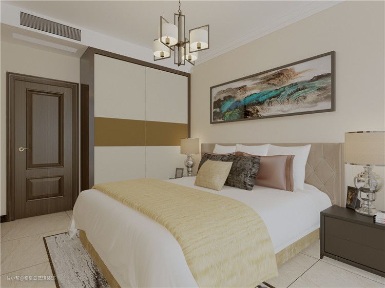 主卧在空间装饰上采用简洁、硬朗的直线条,用色淡雅,创造出柔和宁静的气氛。床头的山水壁画、蓝色祥云地毯、深棕色床头柜,相互呼应,充满古典韵味。
