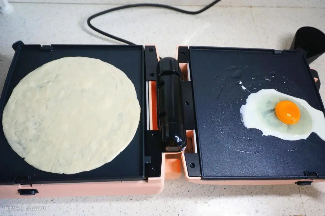 以为牛排机只能煎牛排那就太小看它了,转换一面烤盘,就可以在清晨制作一个快手早餐手抓饼了。