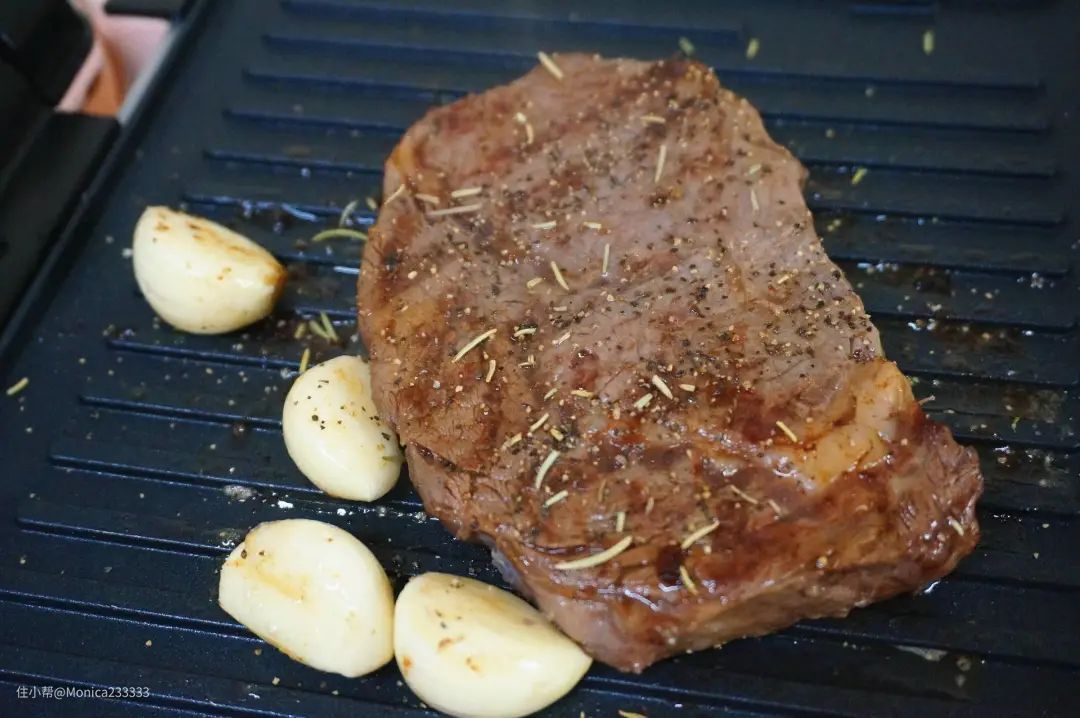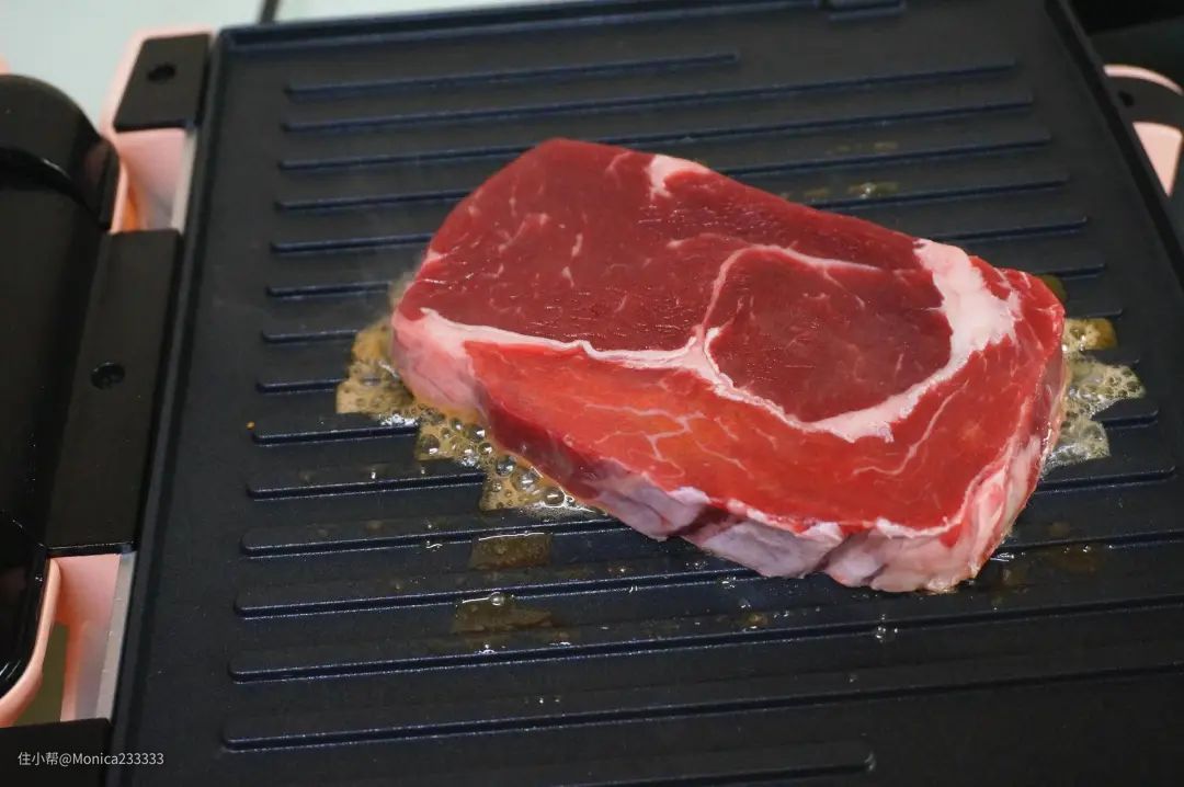 牛排正面放好就不要动它了,煎一分钟后换面再煎一分钟。滋滋作响的声音加上阵阵飘出的香气好像在烤肉,真好玩,不过牛排机并无计时的功能,所以在翻转牛排的时间上我另外使用了计时器。