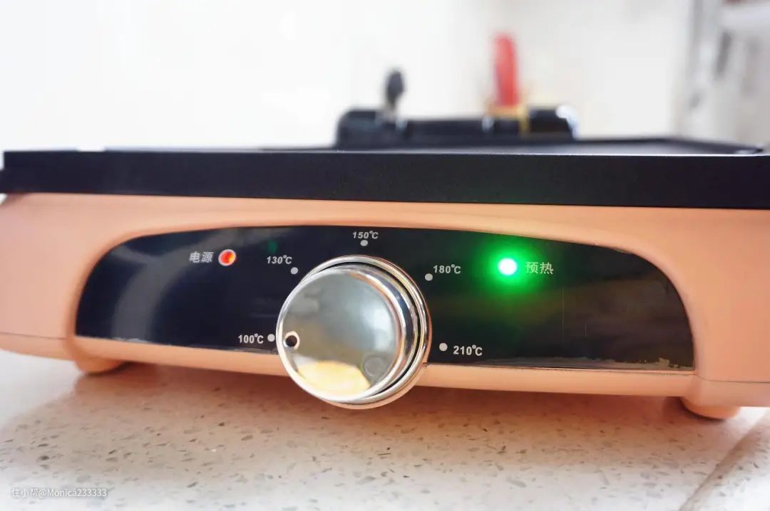 这个牛排机他主要有五段火力可以选择,从100度到210度。是旋钮设计的操作,温度可以控制的更精细,这点还满加分的。
