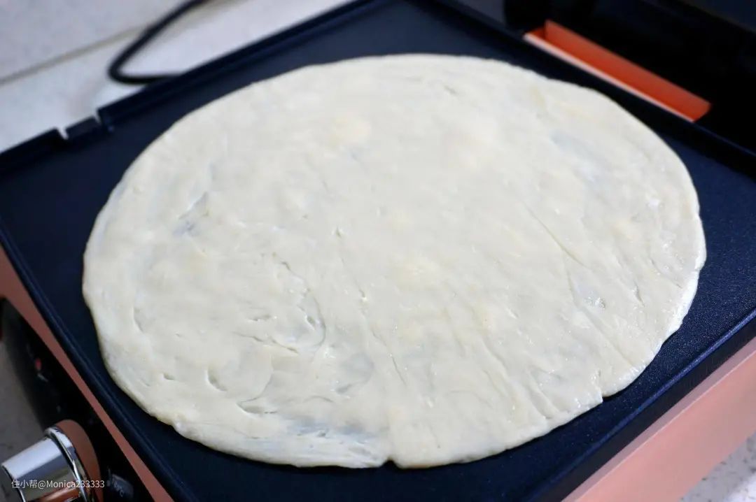 半成品的冷冻手抓饼真的是早餐的好选择,这台机器的烤盘超级大可以放下一整张的饼皮,无需提前解冻,不用抹油,直接将饼皮放在烤盘上即可。