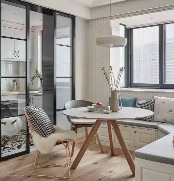 卡座+矮墙可以用于功能区域的划分,这种矮墙式的设计,可以让视觉通透,空间感强,既形成了整体空间的完整性,又保持了空间的相对独立,让房子更宽敞明亮。
