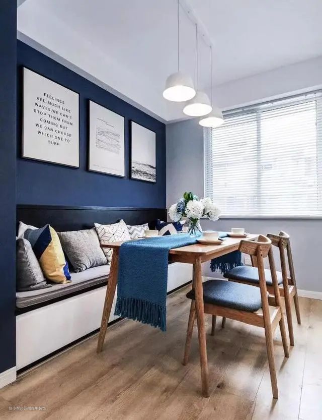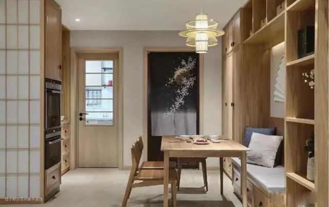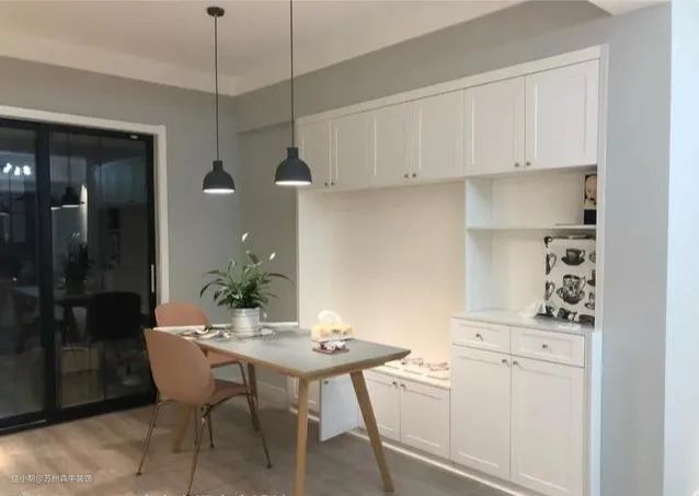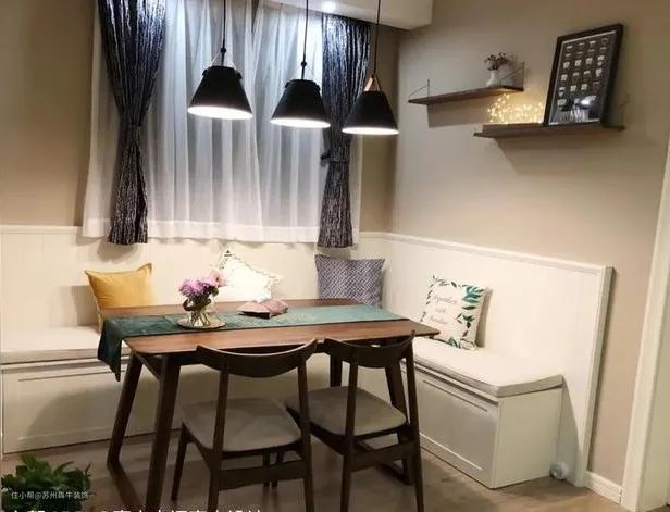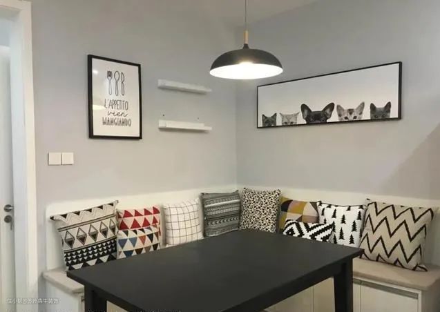 除上面的设计外,如果觉得收纳空间还不够用,可以采取卡座+侧柜的设计形式,在卡座背景墙两侧打高柜,让每1 ㎡的空间利用都发挥到极致,收纳空间无敌。