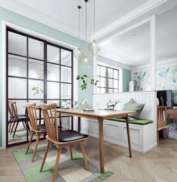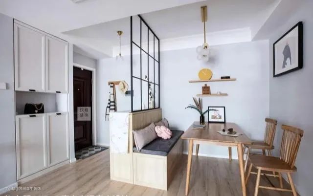 对于进门见厅的户型,如果餐厅设置在进门玄关处,完全可以设计成卡座+屏风的形式,在卡座靠背的立面处制作一块通顶的镂空式或彩虹玻璃等做的屏风,既可以隐约看到客餐厅内的景物,体现一种含蓄的美,又可以实现玄关的功能,真是一物多用啊!