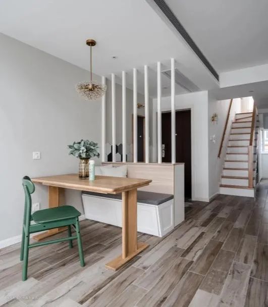 除了卡座+屏风的形式,卡座+矮鞋柜也是有效化解无玄关尴尬局面的方案之一。开门见厅比较尴尬,可以在玄关处设计成卡座式餐厅,让卡座的靠背正对入户门,将靠背制作成鞋柜,既方便家人及客人出去换鞋,又可以起到玄关柜的作用,是不是设计的巧妙哦!