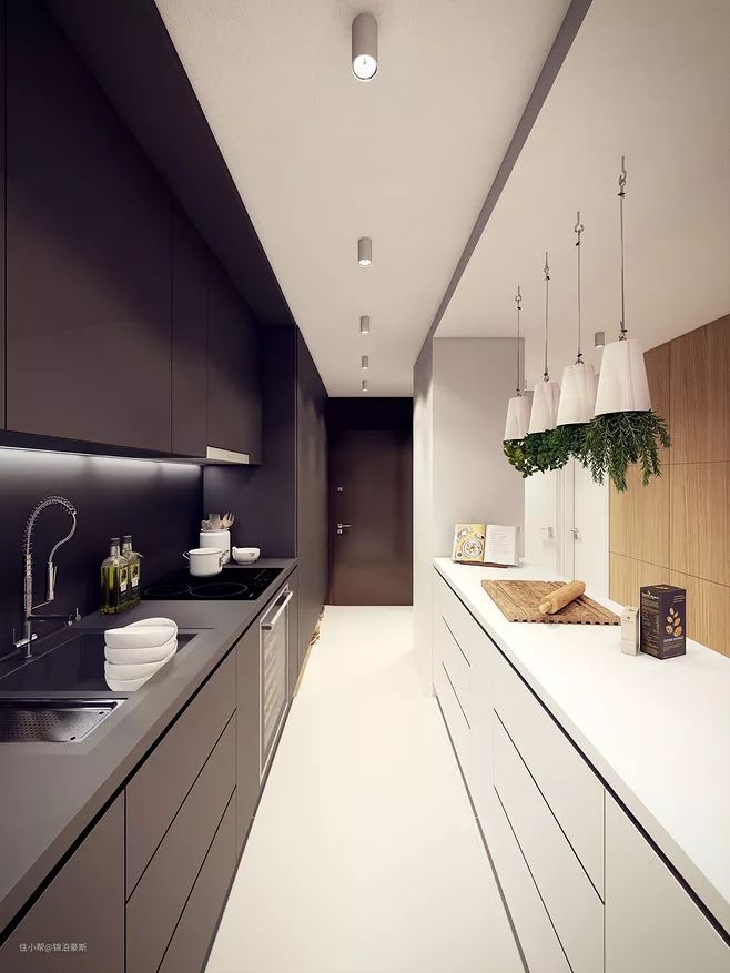 通常的黑色橱柜以简单的线条、几何形状,金属作为主导材料来呈现的。隐藏式把手、内嵌式家电都是有机组成的一部分。