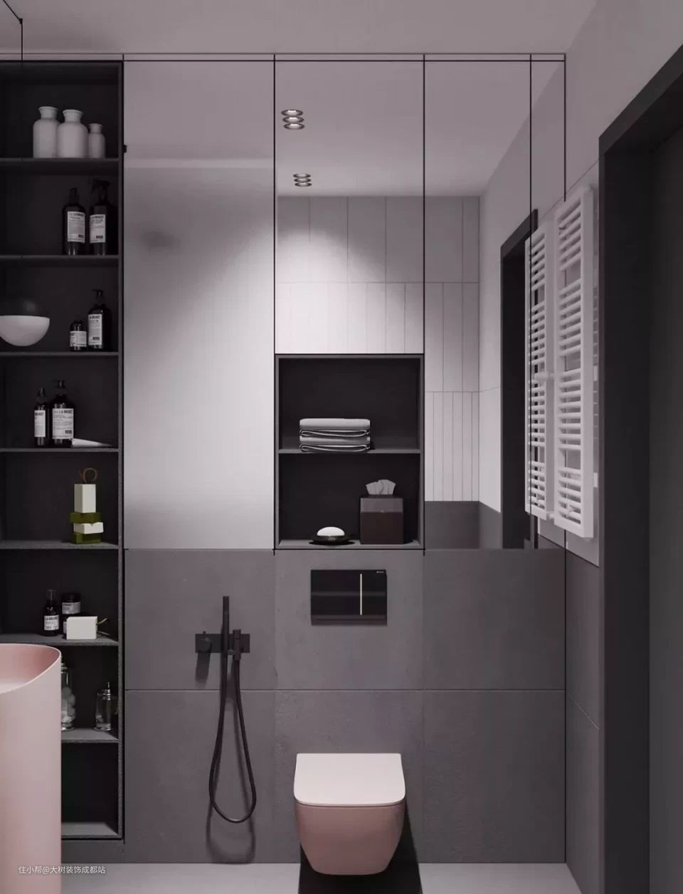 但是如果将下水改为墙排,下半部分悬挂,马桶、洗手台用壁挂式,悬空不落地,像这样: