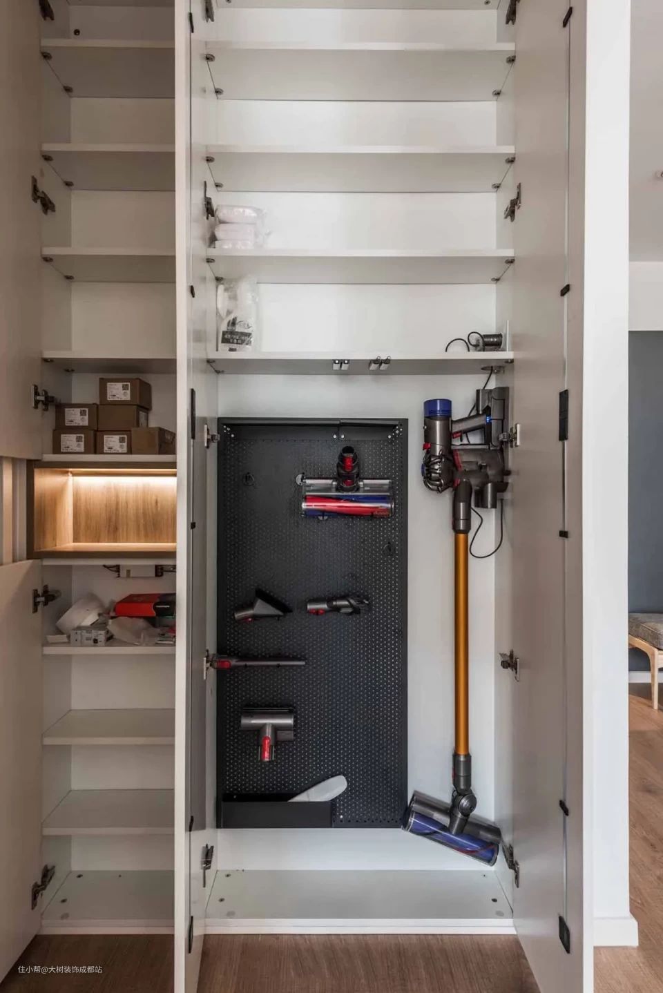 哪里需要放哪里,收纳一些零零碎碎的小东西超好用长长短短的扫把、拖把、吸尘器等配件,以及一些小物件,都可以用挂钩安置到洞洞板上,用的时候一眼就能看见。