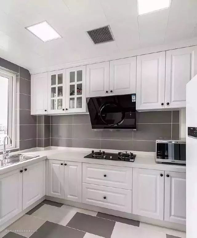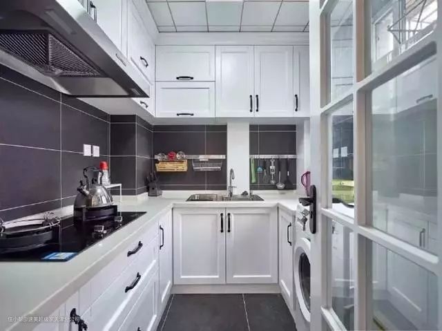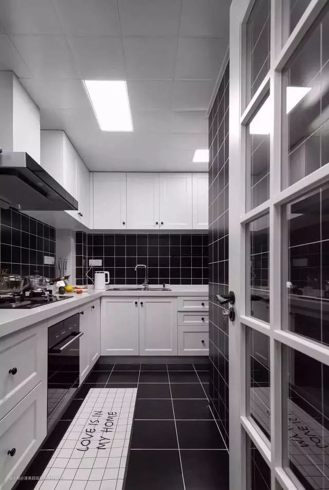 最后一款厨房设计适合大多数的家装风格,黑色格子墙砖搭配白色橱柜,经典配色,时尚简约,耐看不过时,L型橱柜将空间利用达到最大化,储物足,空间大易操作。
