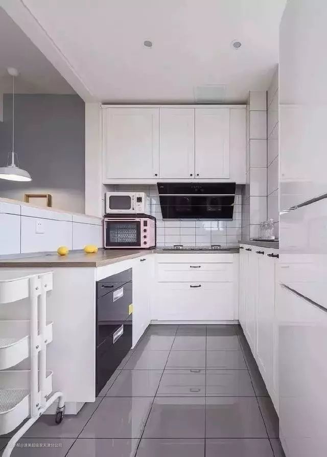 第一种应该是很多家庭都比较钟爱的一款,白色橱柜搭配灰色墙面,显得格外整洁大方,地砖也做了白色和灰色拼接,整体感很强,这样的色调搭配,卫生打扫起来会比较方便。