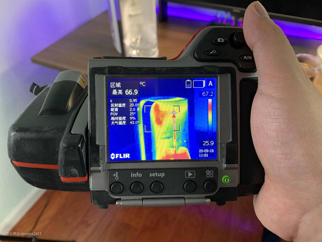 ▲当水温设定这65℃时,实际出水温度66.9℃。由于需弥补水在空气中散失的热量,出水温度比设定值稍高还是非常合理的