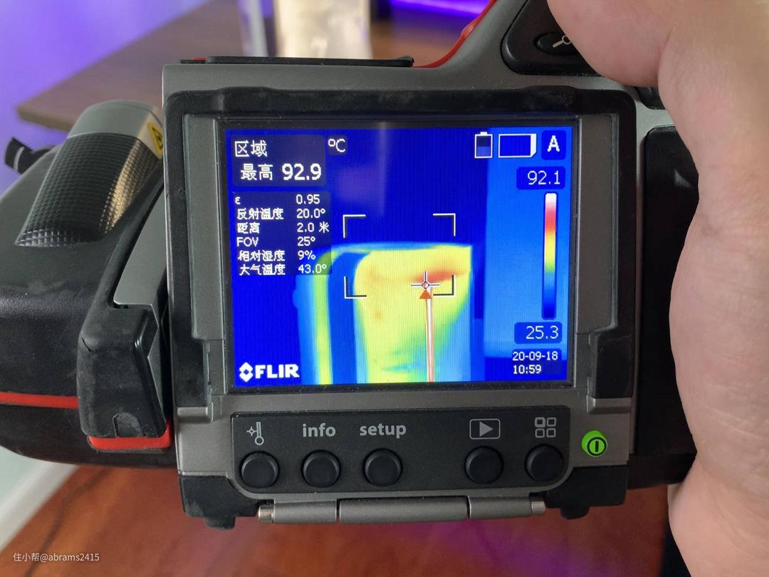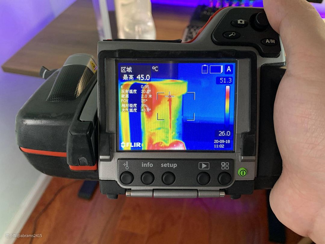 ▲使用热成像仪进行水温设定值与实际出水温度试验,当水温设定这45℃时,实际出水温度45℃