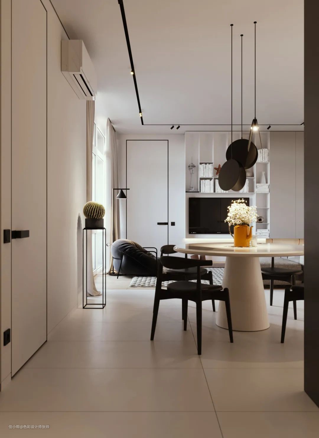 餐厅借用了客厅落地窗的明亮光线,更加敞亮,色调上也延续了客厅的颜色保持了空间色彩的整体性和流动性,黑色的餐椅搭配白色的石材餐桌,现代且前卫,橘色的花瓶整个空间最吸睛的重点色,让空间氛围更加灵动活泼。