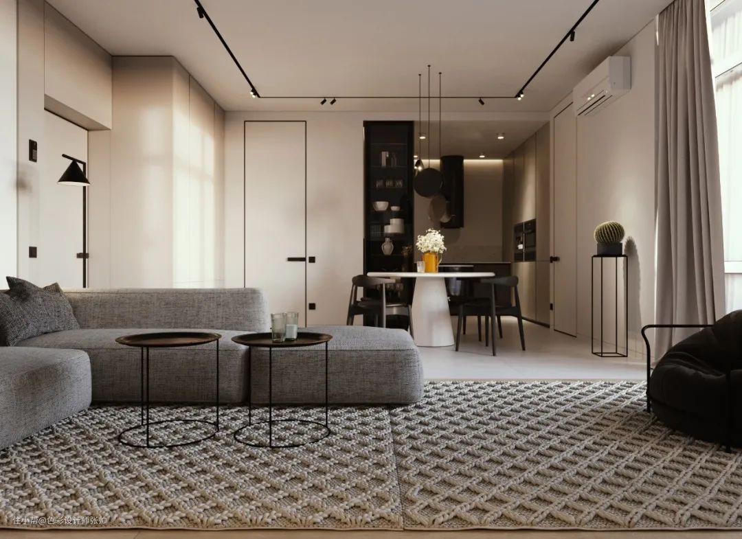 高级的颜色往往更加简单舒适,在色调上尽量保持一致,浅浅的暖灰色墙壁拉伸了空间的高度,让视野效果更加宽敞开阔,搭配同色系的窗帘,温馨高雅;灰色的布艺沙发造型简洁,搭配简约的铁艺茶几,利落的线条彰显出空间的高级氛围。