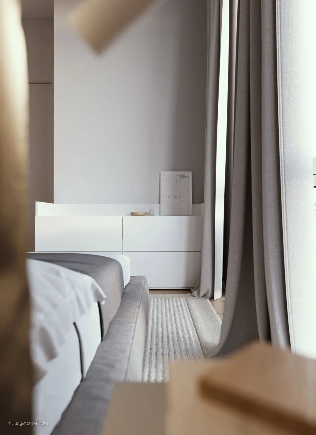 简洁的配色形成了舒适的卧室氛围,浅浅的灰色没有白墙如此刺眼,搭配原木地板,一股高级的品味被彰显出来,白色的百叶窗在起到装饰隔断的同时也保证了光线的充足,灰色的窗帘和灰色的布艺床,绅士格调尽显,米色的织物地毯柔和而温柔,暖黄色的灯光也成了颜色装饰的一部分,治愈的暖色调会让人身心放松,情绪缓解。
