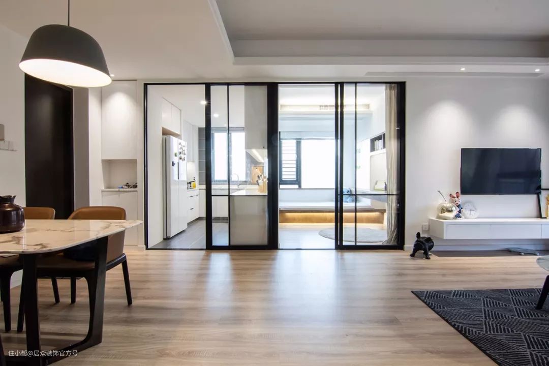 ②借光。这也属于通过拆改墙体改善采光的其中一种方式,也能扩大室内的采光面积。比如家里的墙体越多,就越会阻挡光线,如果把隔墙打掉,替换成透明的玻璃隔断,就能起到借光到其它空间的效果,对于客厅处于房屋中间又不想更改客厅位置的业主,这个方法就很适合。这里需要注意的是,房屋拆改必须向物业报备,物业允许且非承重墙才可以拆改。