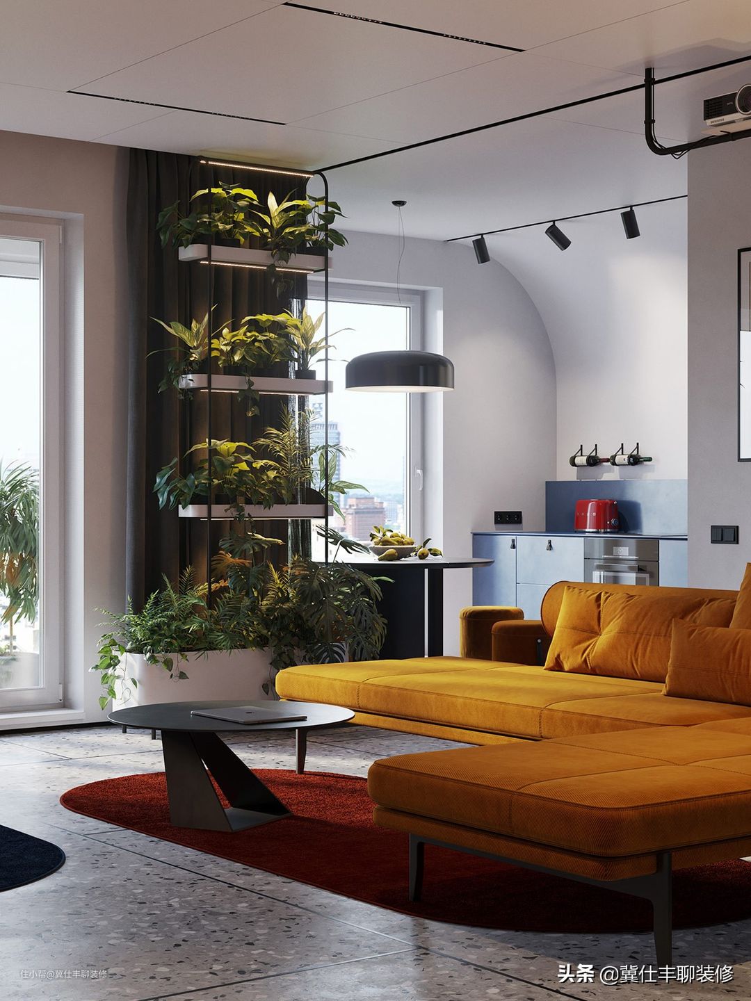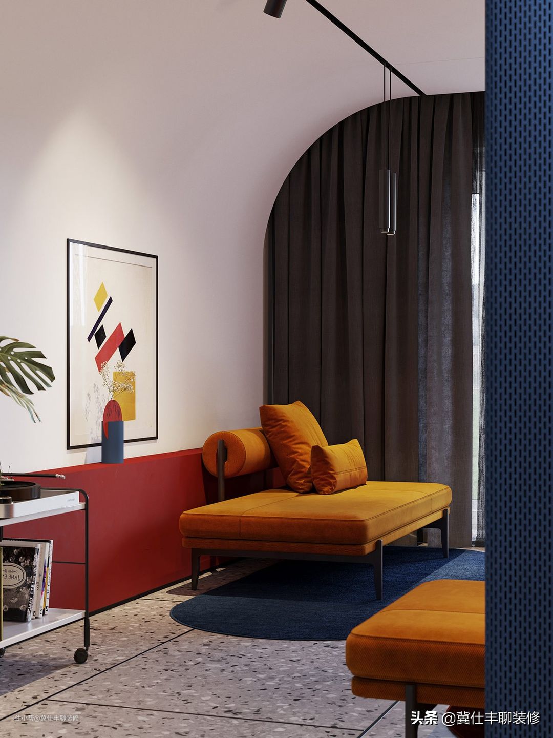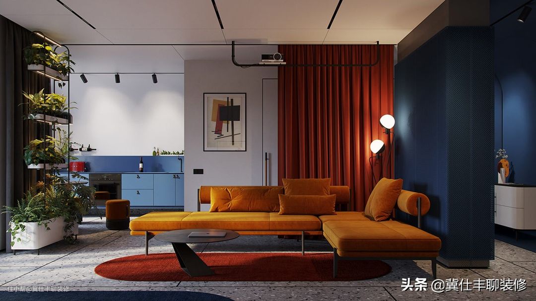 ▲ 大色块继续延伸至客厅区域,蓝色的最佳搭配色橘黄和红色也被以大色块的形式引入,冷与暖的撞色,让空间感和秩序感分外强烈!