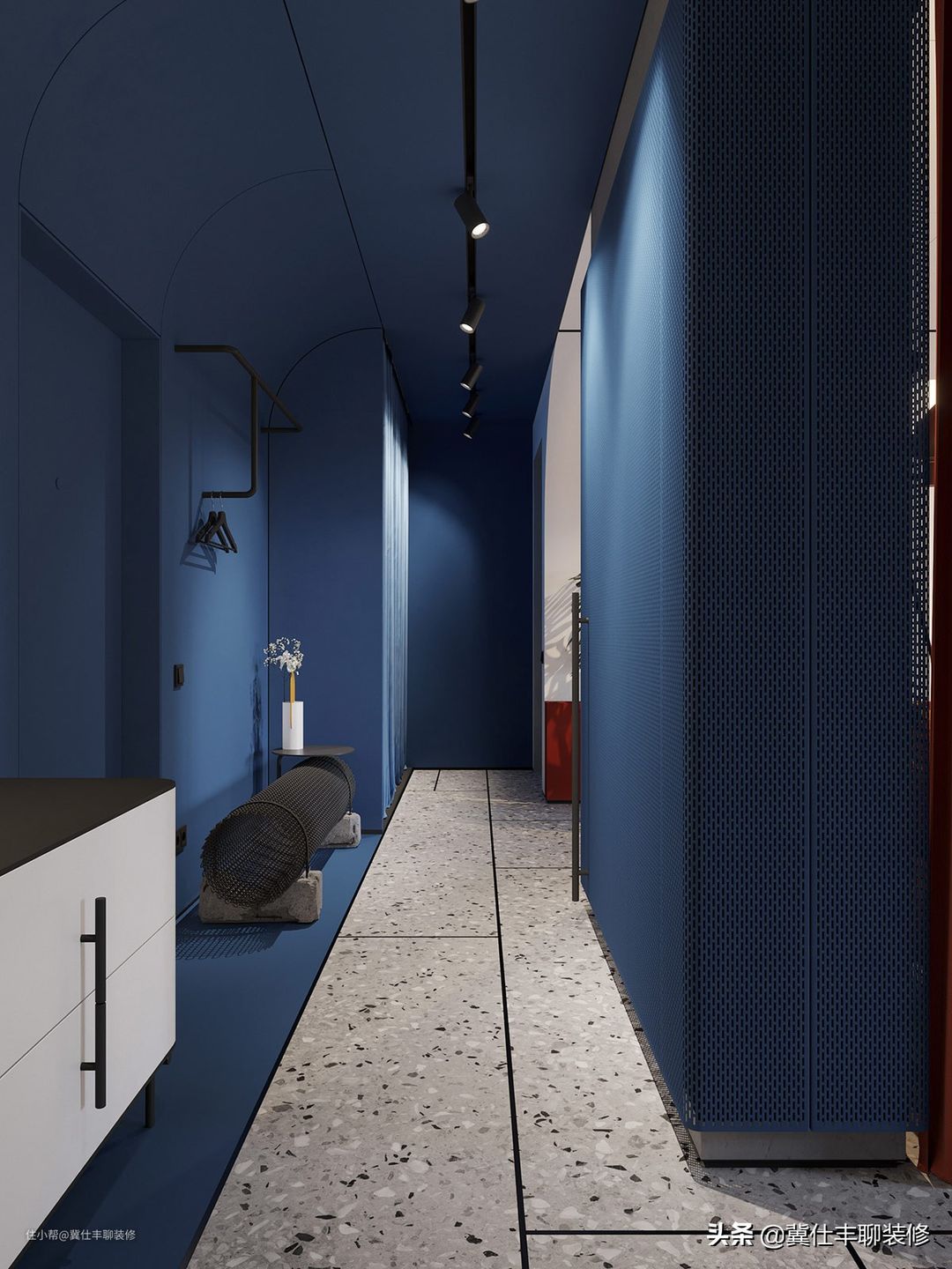▲ 进入玄关区,水磨石地砖地面,搭配黑色美缝剂,而蓝色的墙面和顶面则成为空间的主角,一条轨道灯位于天花板上方,光线分别照射两侧,而顶面和柜体的弧线造型,则柔化了蓝色的冰冷感,大色块的蓝,将白色的柜体衬托得格外强烈。