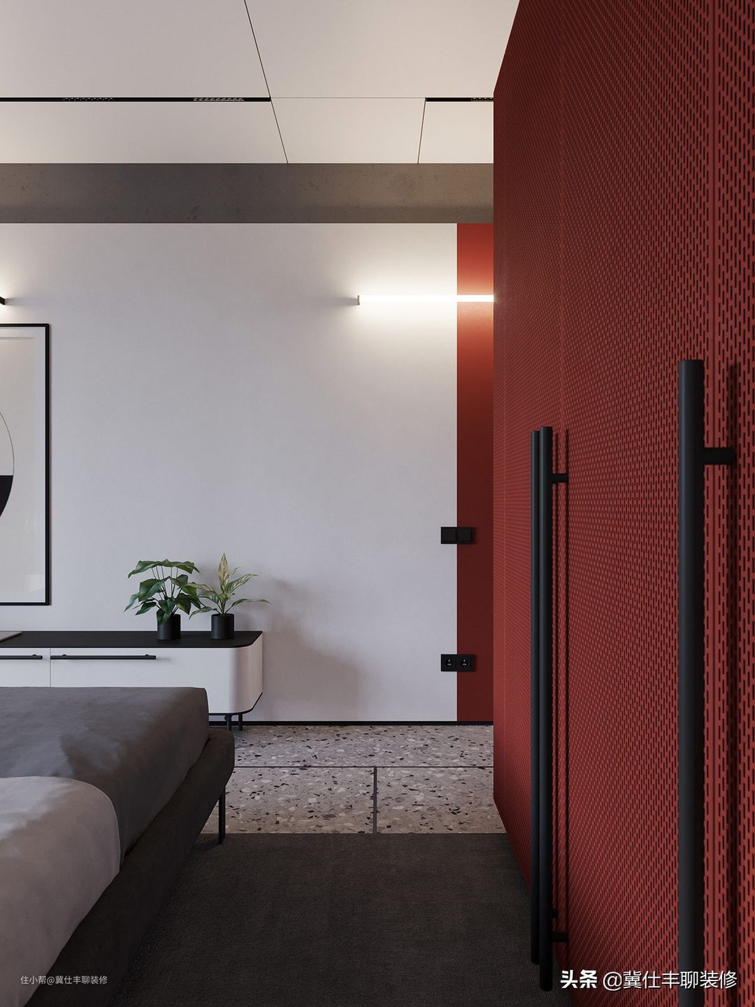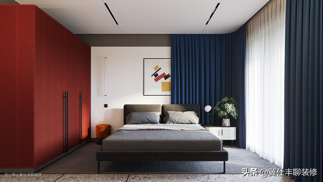 ▲ 卧室的设计依旧是大色块的组合,一边是蓝,一边是红,正所谓一边是海水,一边是火焰,而中间则以灰色系进行调和,展现出完美的艺术效果。