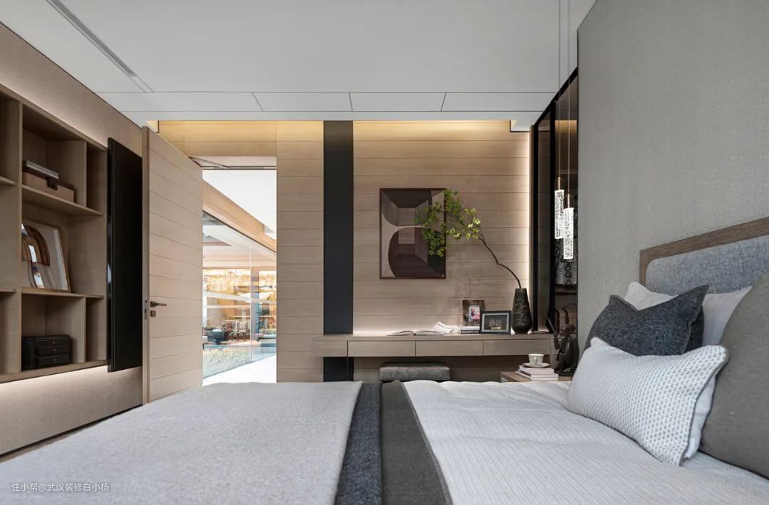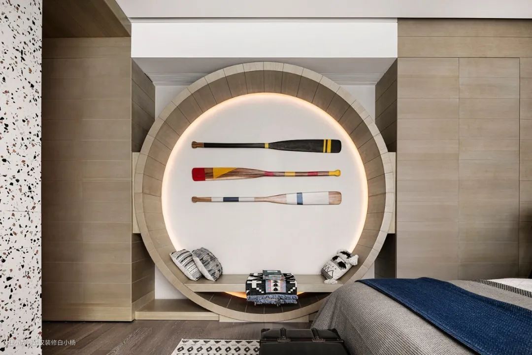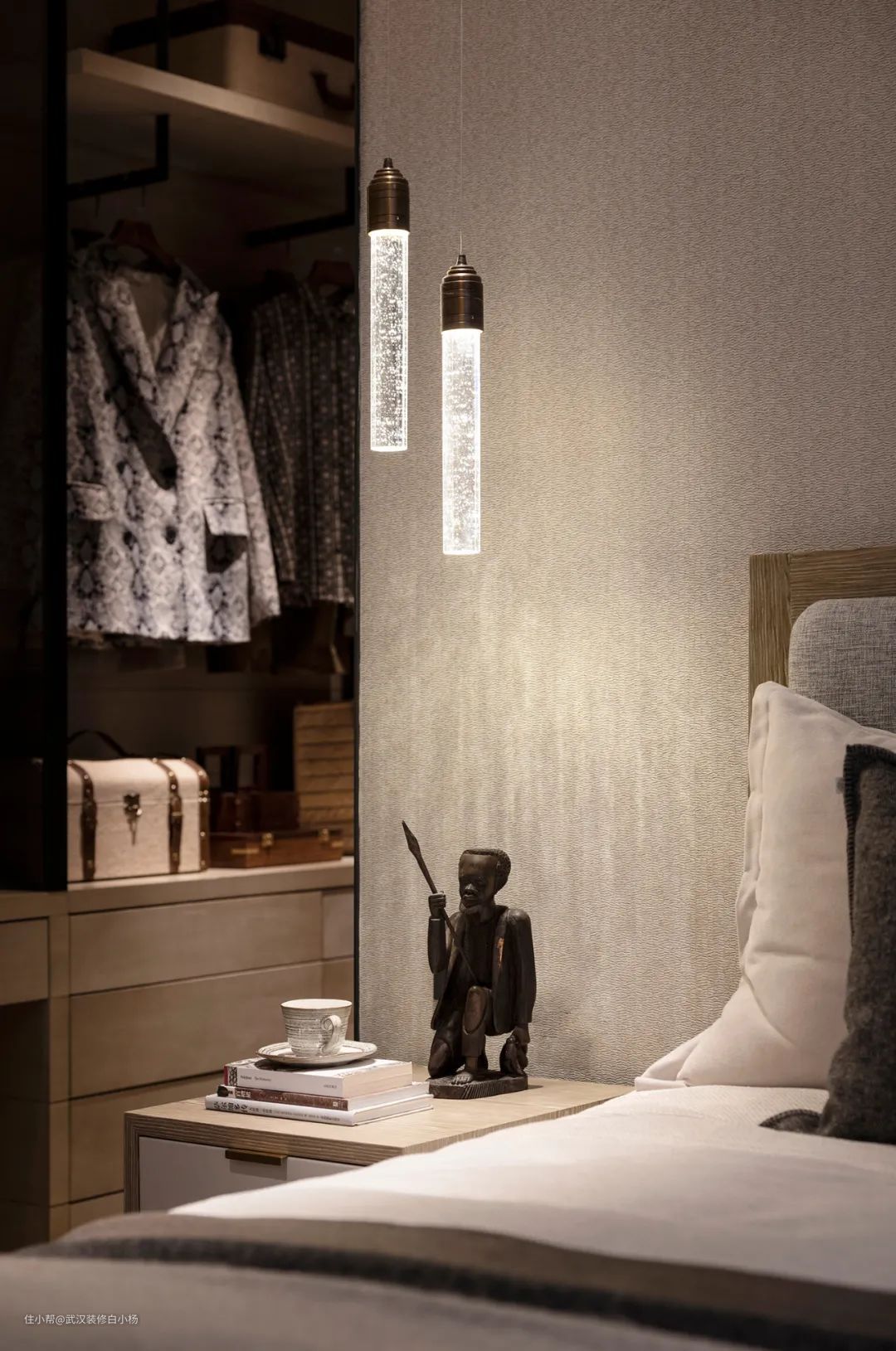 一片白色帷幔随意铺搭,在主卧沙色主调上轻盈摇荡。阳光漫入,重返悠闲假日时光。象征着部落图腾文化的地毯,一张一弛,让空间介于精致与随性之间,形成历史与自然的蜿蜒流转。