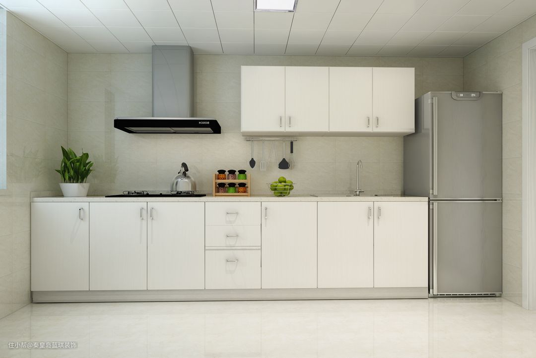 一字型厨柜设计,储物空间增大。大理石台面,结实易清洁。玻璃门隔开了厨房与餐厅,防止油烟味道弥漫室内。