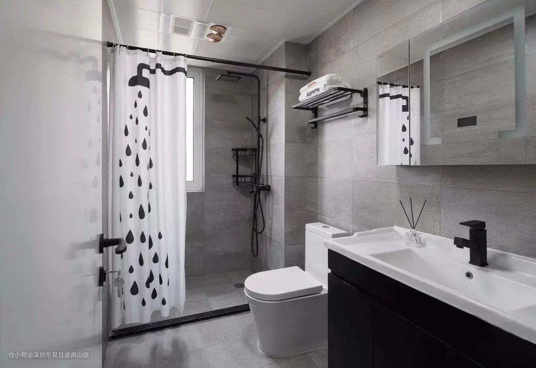 灰色调的设计在近几年是非常流行的,家里的卫生间可以现在通铺灰色调的哑光砖,搭配白色和黑色的软装和卫具,看起来年轻又大方。
