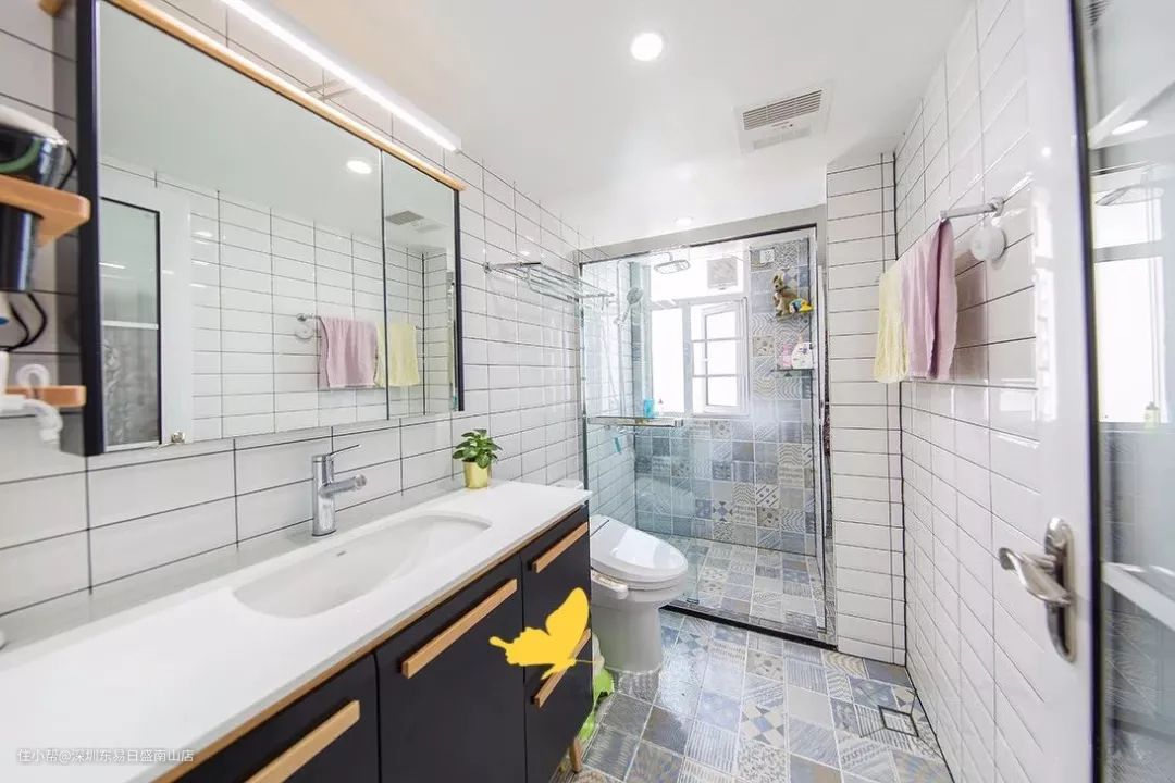 在简洁大方的卫生间内加入了趣味的花砖来作为点缀,把淋浴区和地面铺上蓝色调的花砖,让卫生间看起来也更有文艺范。