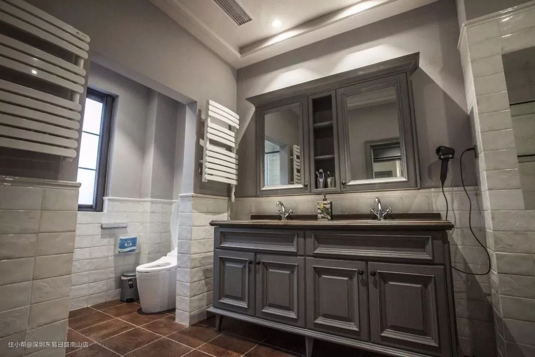 家里的公用卫生间可以选择把洗手台做在卫生间的门外,这样日常使用的时候会方便一些,而且洗手台独立出卫生间外,也起到装饰效果。