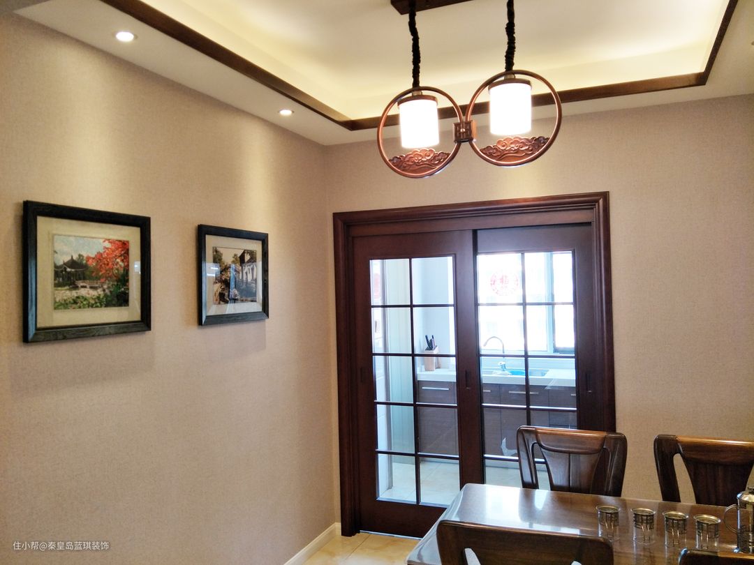 餐厅的吊灯也是一个亮点,造型结合了中式古典元素,暖色灯光映衬出温馨的居家氛围。